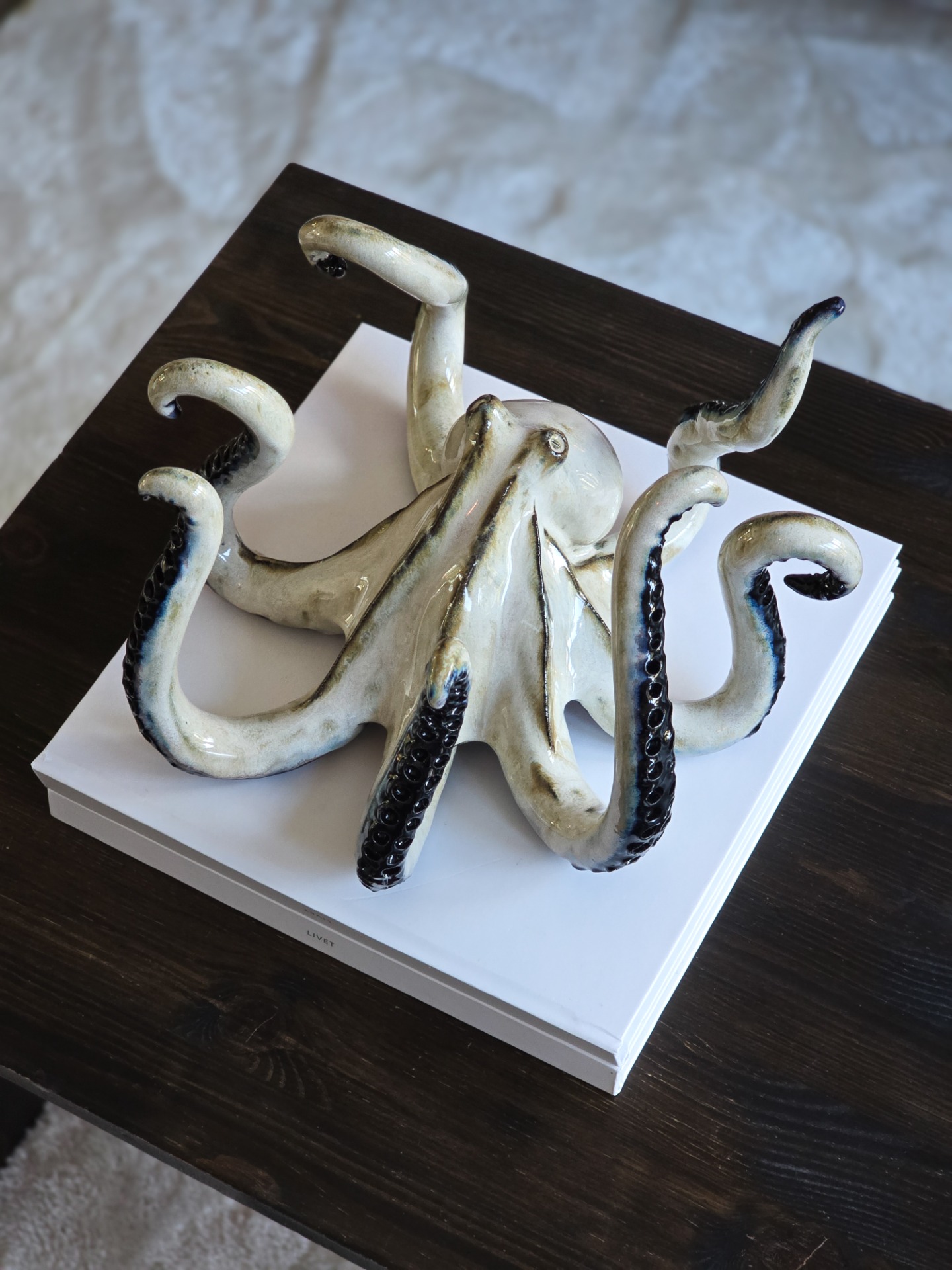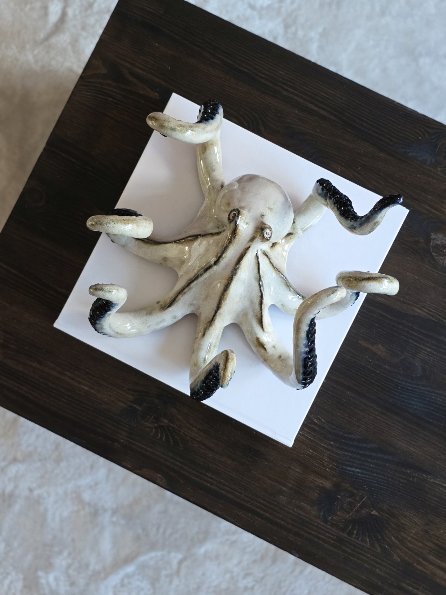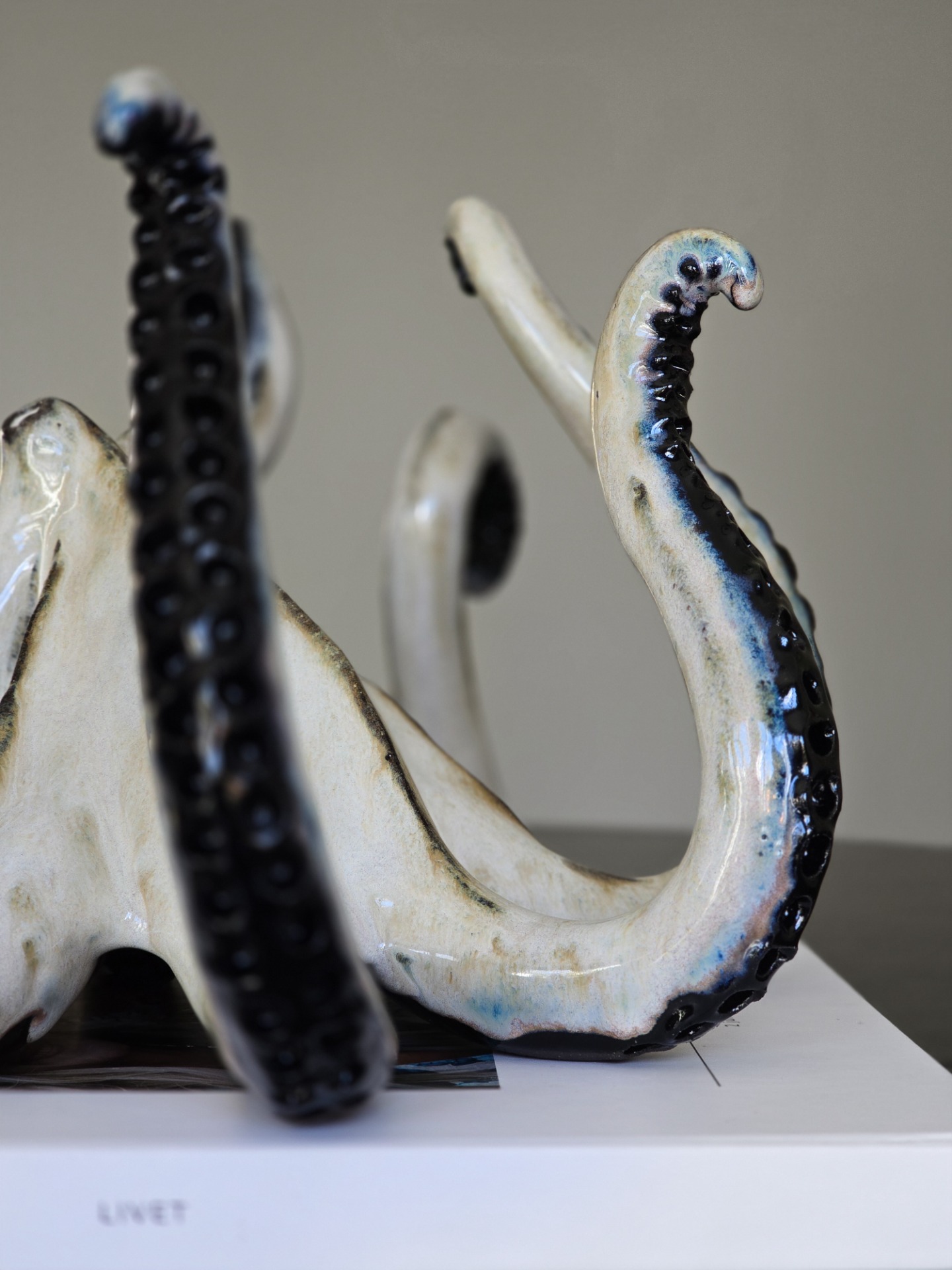 En sjuarmad bläckfisk i svartbrun stengodslera. Glaserad i mjuka beiga toner som möter den mörka lerkroppen. Den mörka kroppen under ytan ger kontrast och tyngd, medan inslag av blått och svart bryter fram som oväntade accenter.