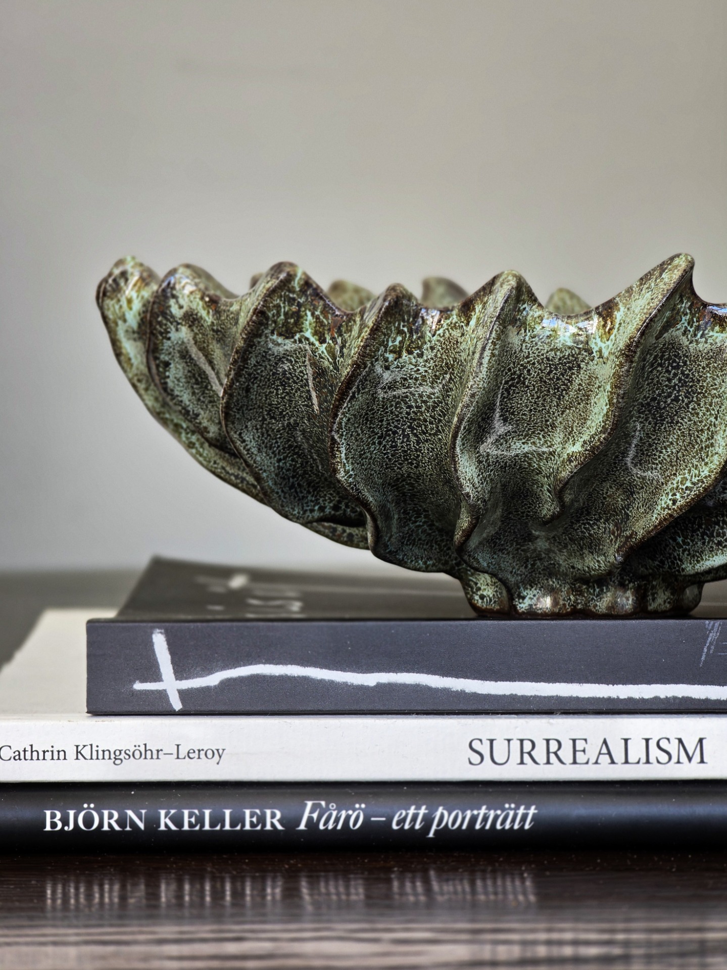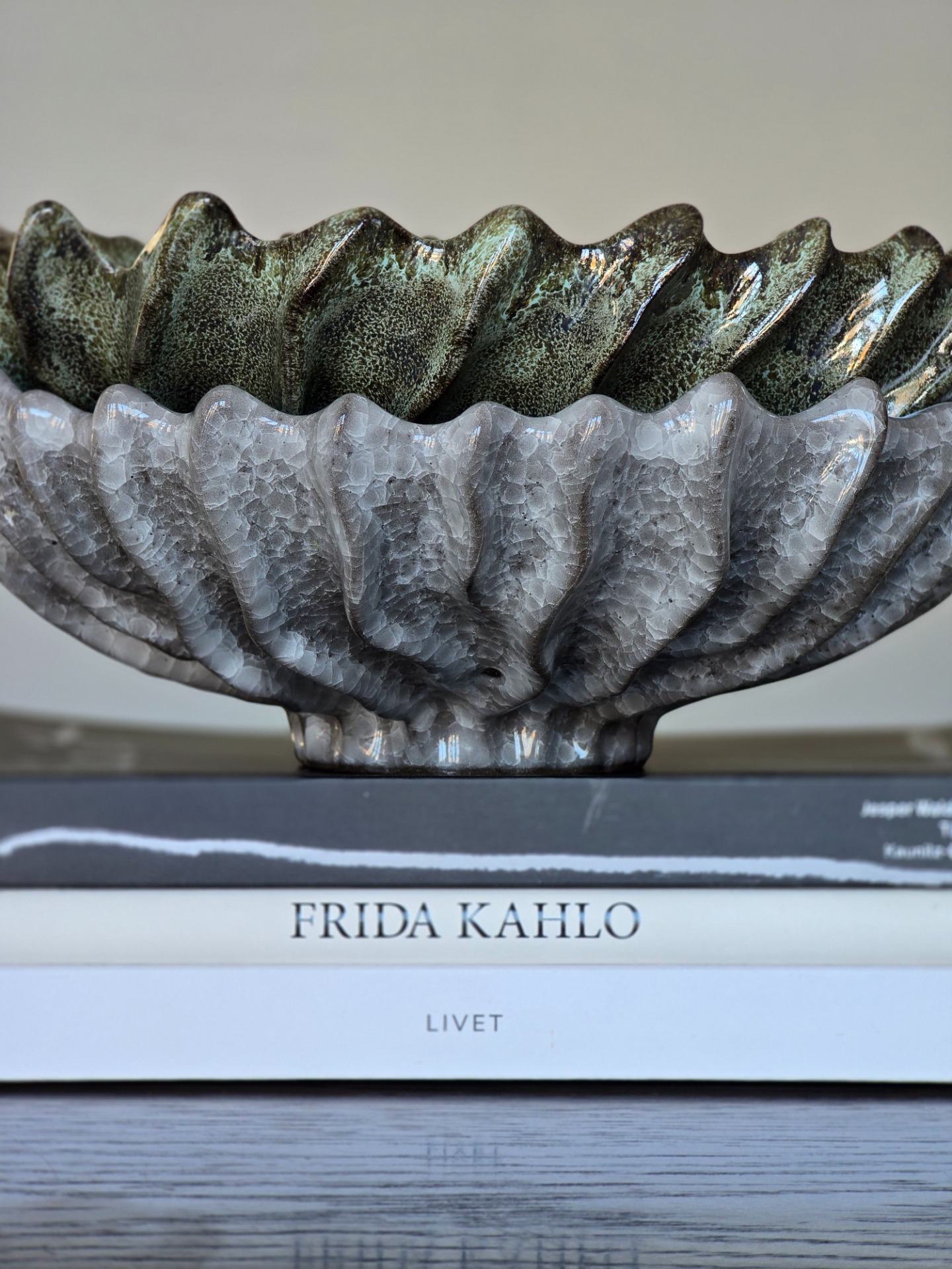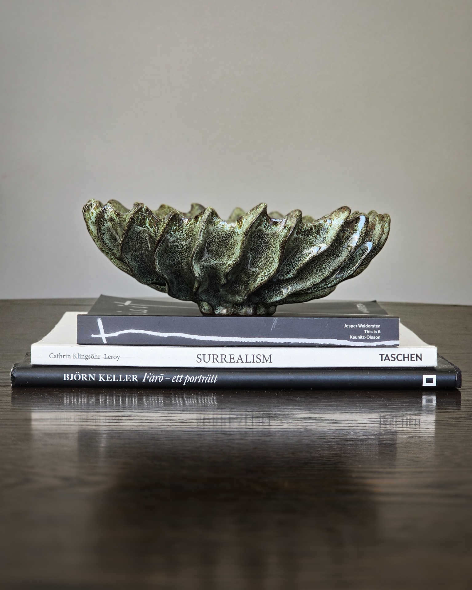 Den glaserade ytan i dämpade gröna toner ger ett naturligt uttryck med subtil lyster.