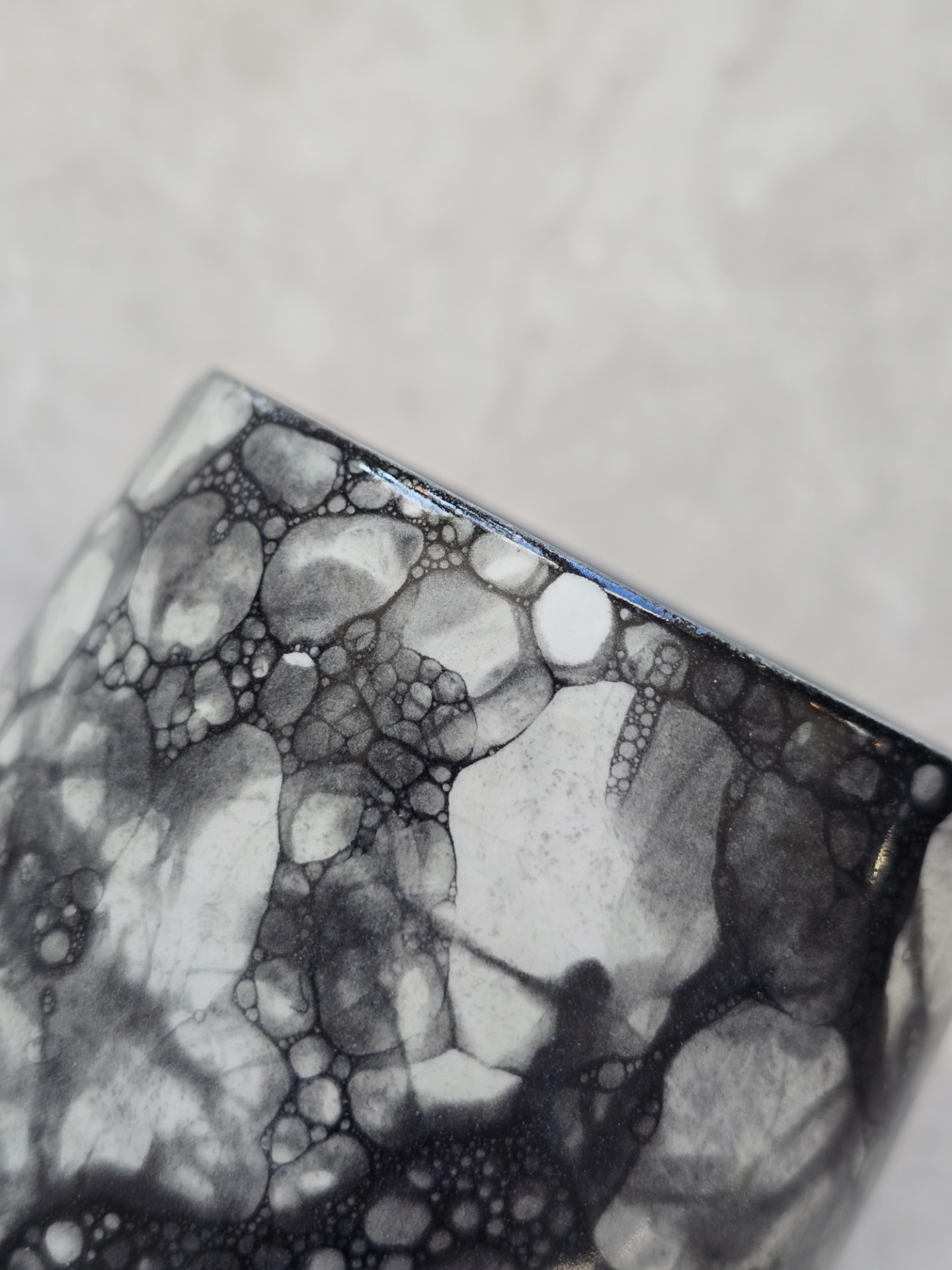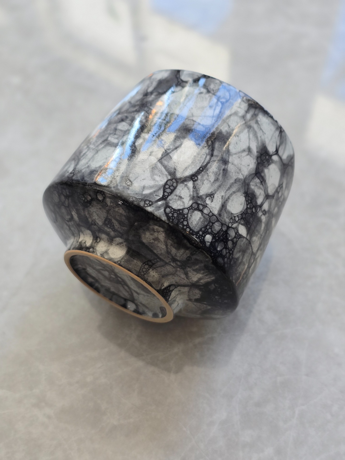 Utsidan är blank och insidan bär en svart, matt glasyr. Observera att varje kopp är unik och att variationer i mönstret förekommer som en naturlig del av det mänskliga hantverket.