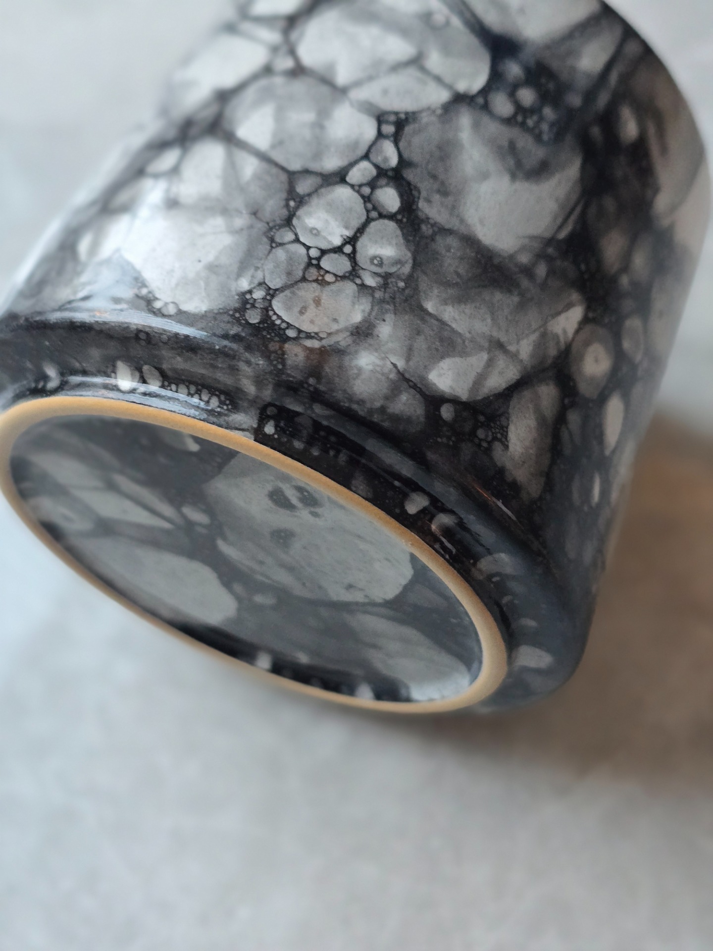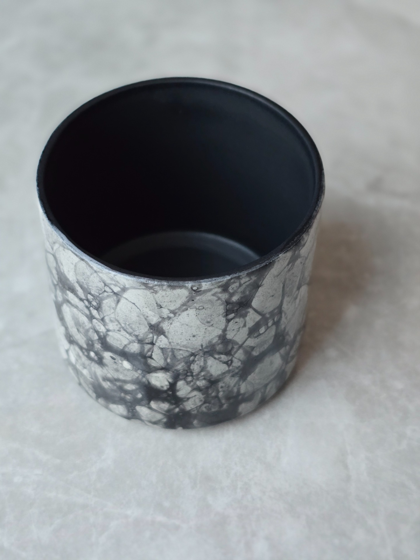 Utsidan är blank och insidan bär en svart, matt glasyr. Observera att varje kopp är unik och att variationer i mönstret förekommer som en naturlig del av det mänskliga hantverket.