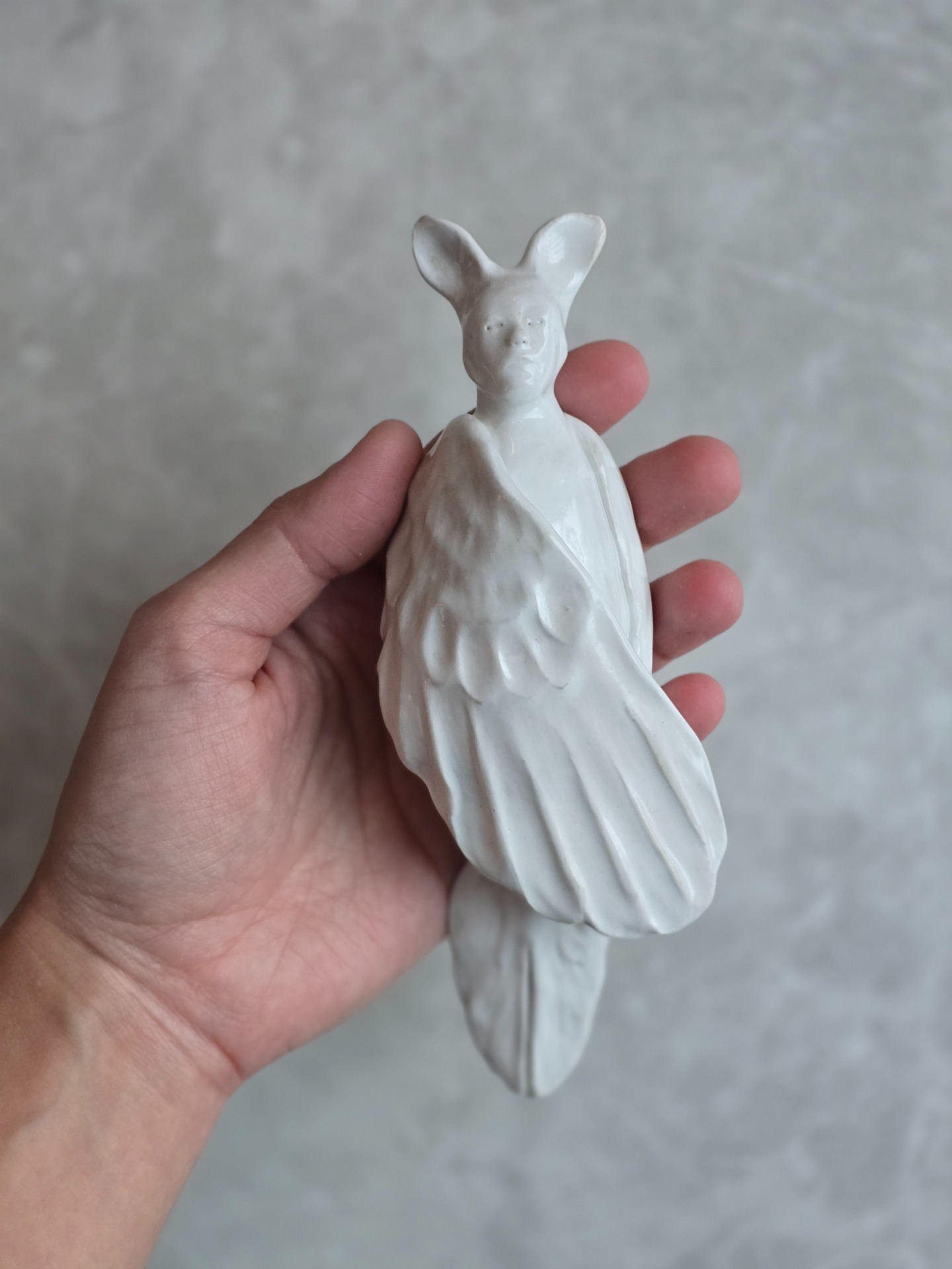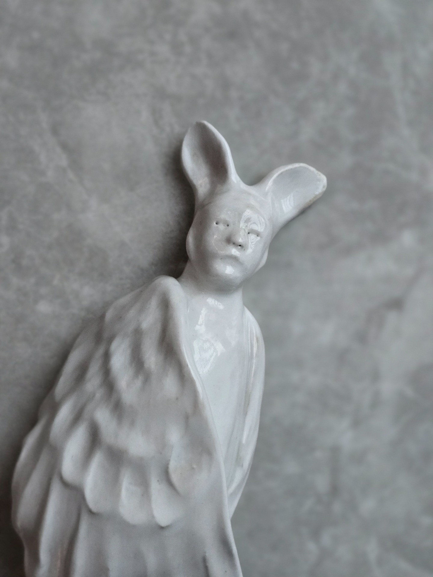 Människofåglar – stillsamma väsen som rör sig någonstans mellan människa och fågel. Varje vägghängd skulptur är varsamt formad och klädd i en vit, blank glasyr som fångar ljuset och ger liv åt ytan. De tar inte stor plats, men de vill gärna bli sedda – som en tyst påminnelse om skörhet, frihet och det som binder oss samman.