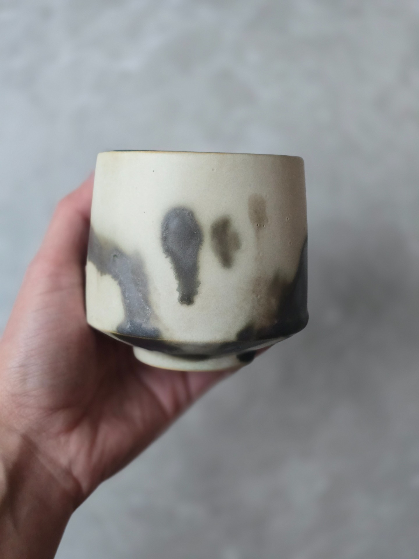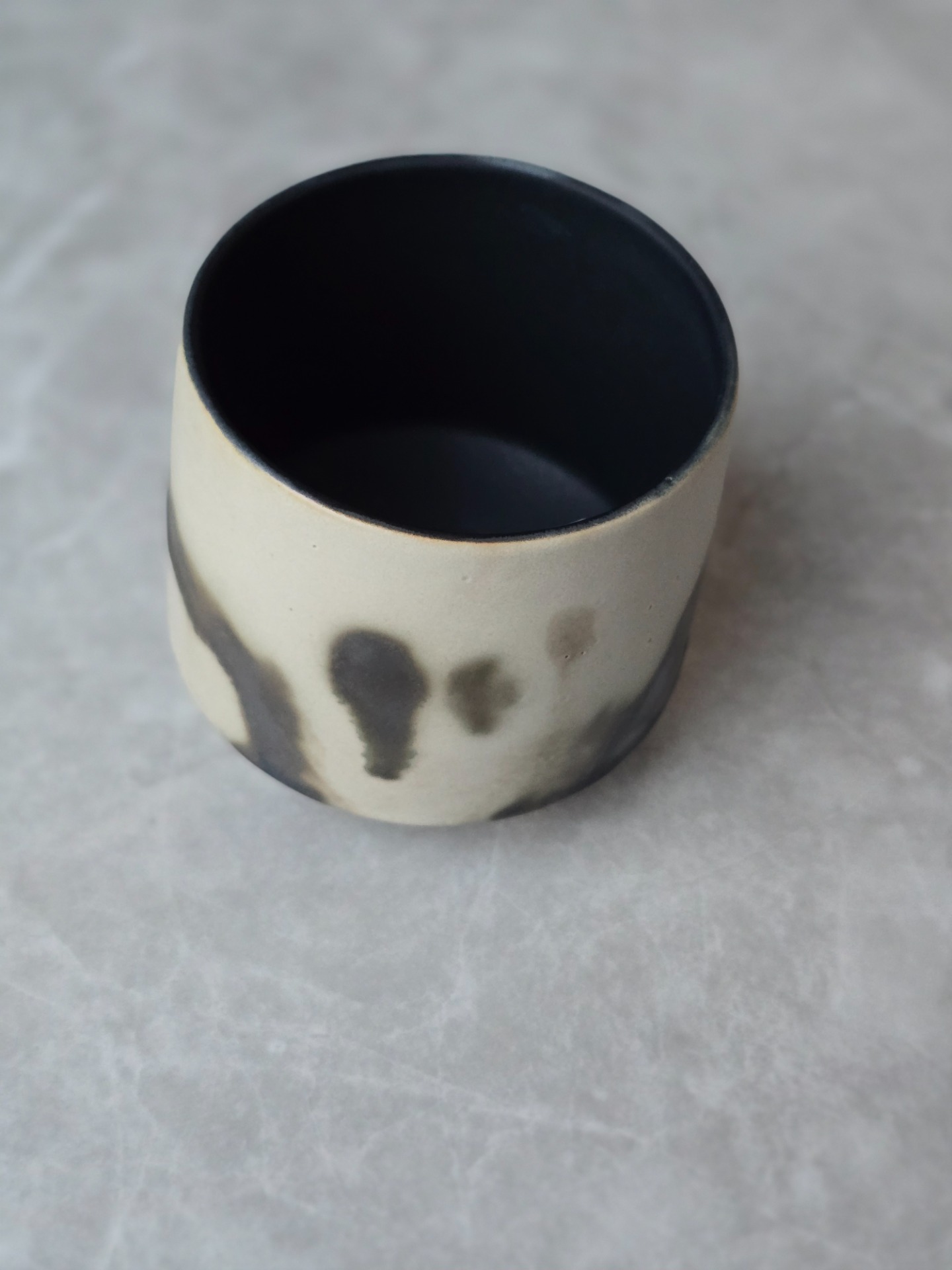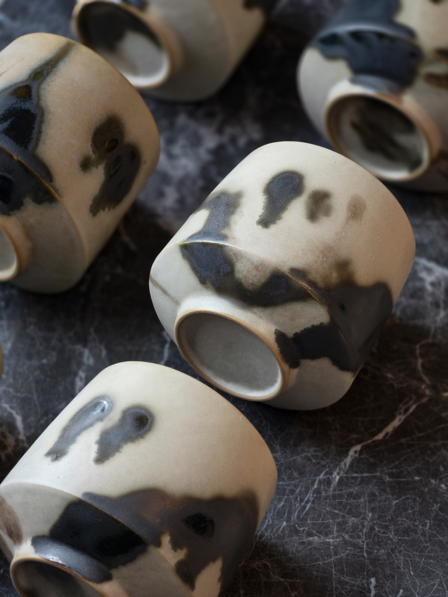 Varje kopp får sin egen personlighet - lite ojämn, lite oväntad men alldeles egen. Glasyren rör sig mellan blankt och matt, ljus och mörker. Utsidan är inte helt slät utan bär små ojämnheter.