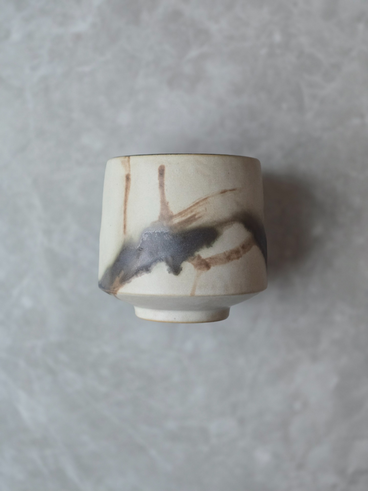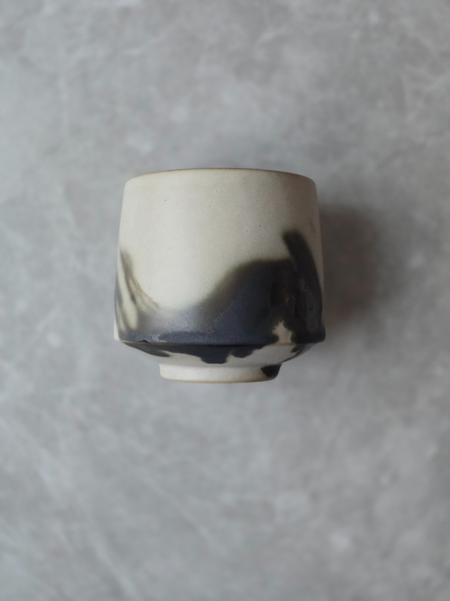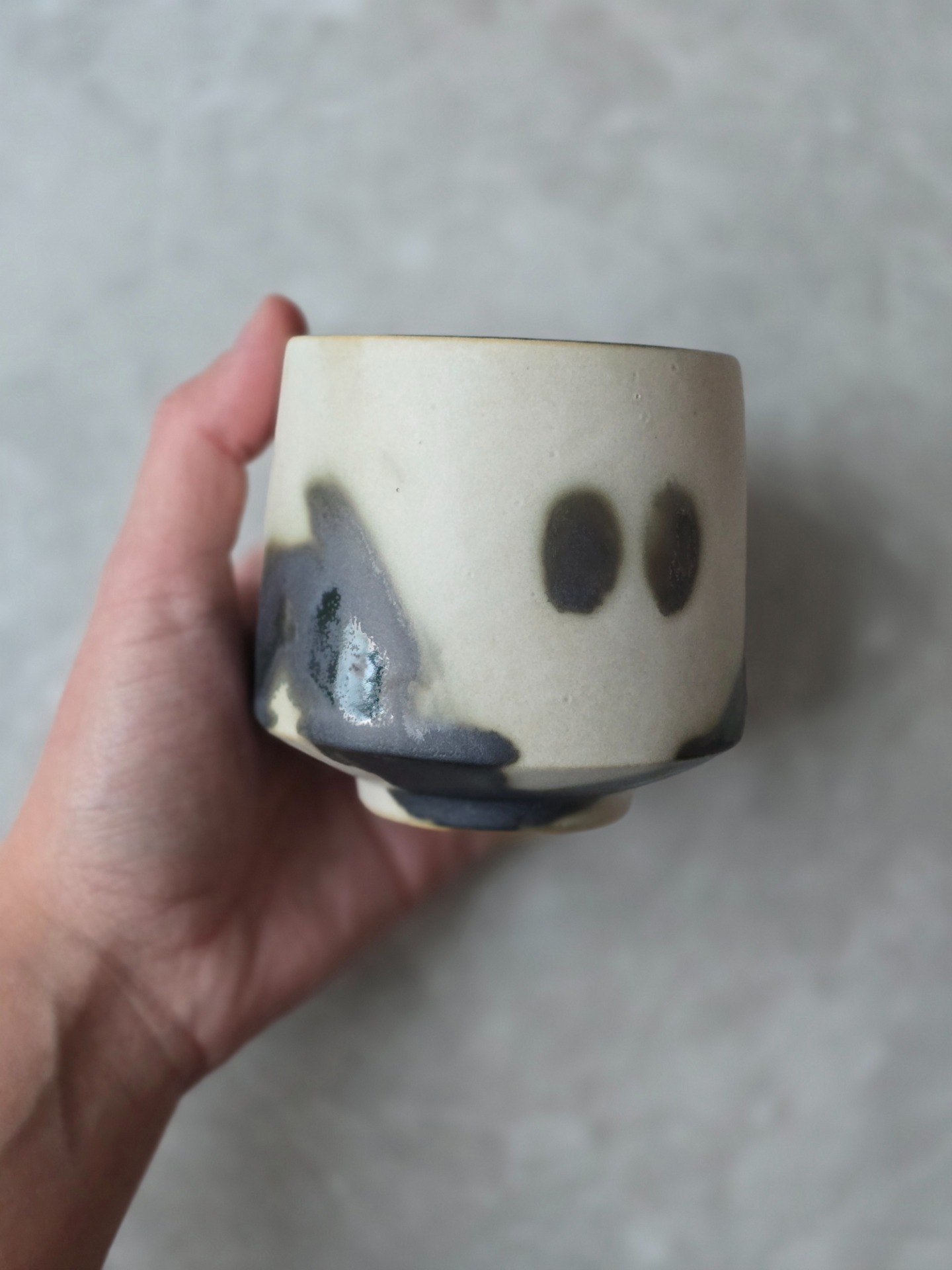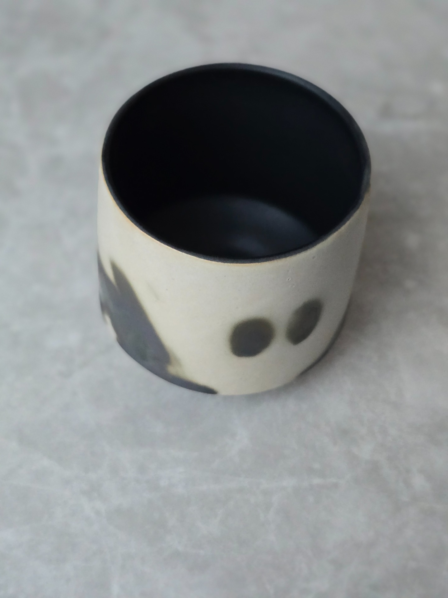 Varje kopp får sin egen personlighet - lite ojämn, lite oväntad men alldeles egen. Glasyren rör sig mellan blankt och matt, ljus och mörker. Utsidan är inte helt slät utan bär små ojämnheter.