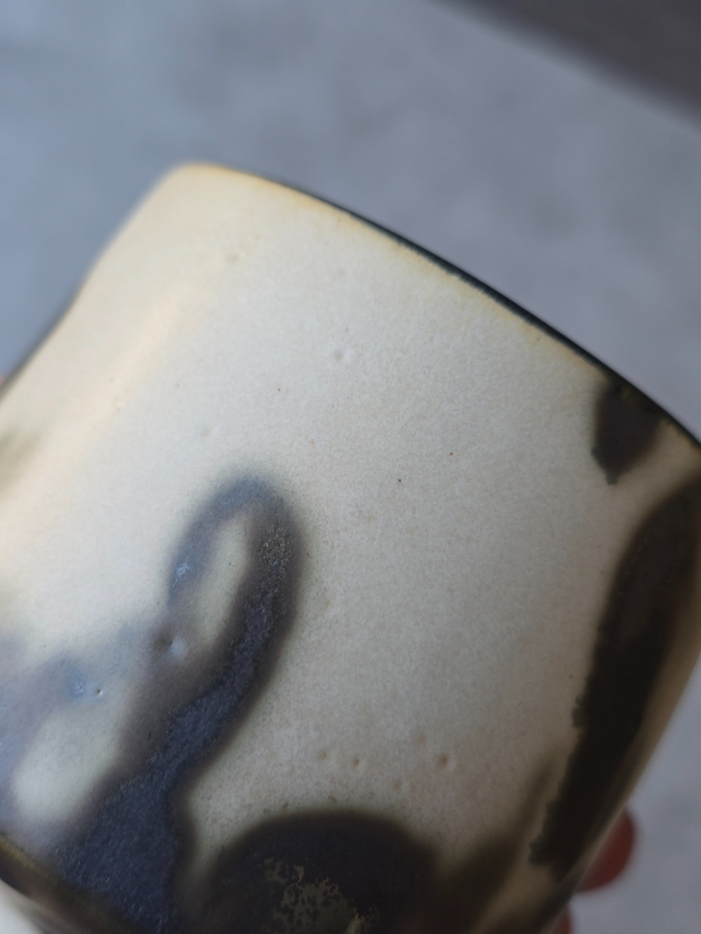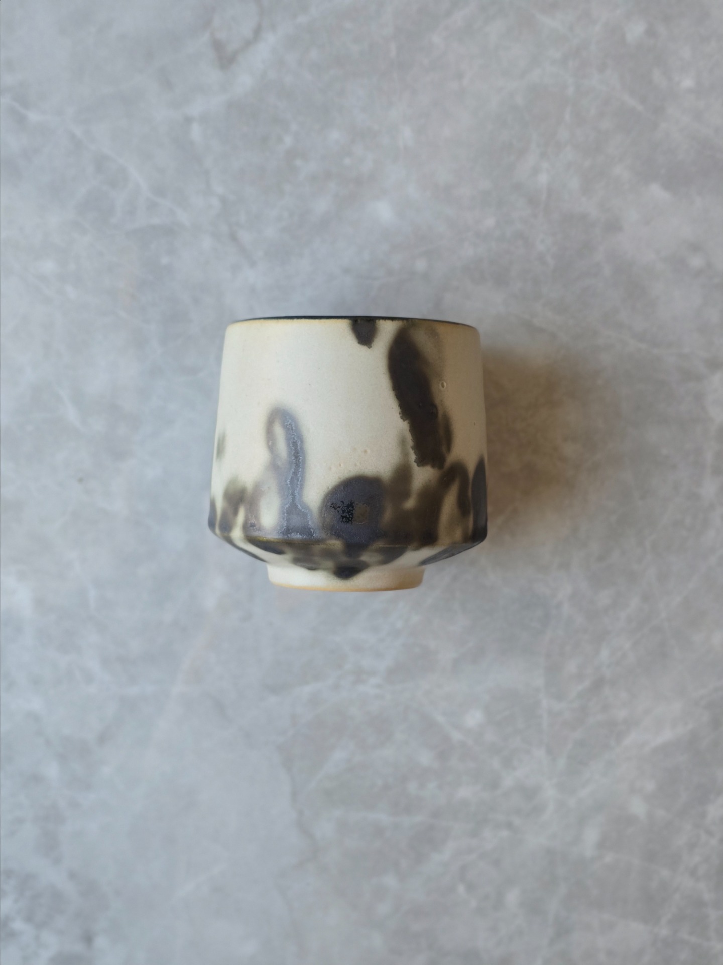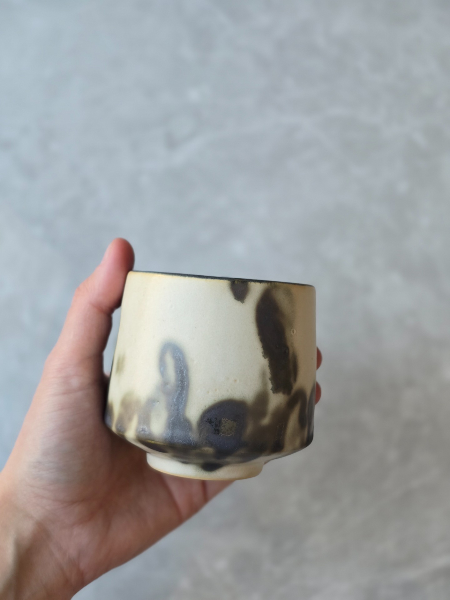Varje kopp får sin egen personlighet - lite ojämn, lite oväntad men alldeles egen. Glasyren rör sig mellan blankt och matt, ljus och mörker. Utsidan är inte helt slät utan bär små ojämnheter. Insidan är mattsvart.