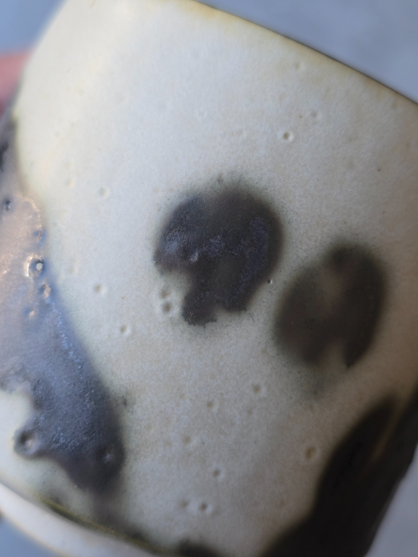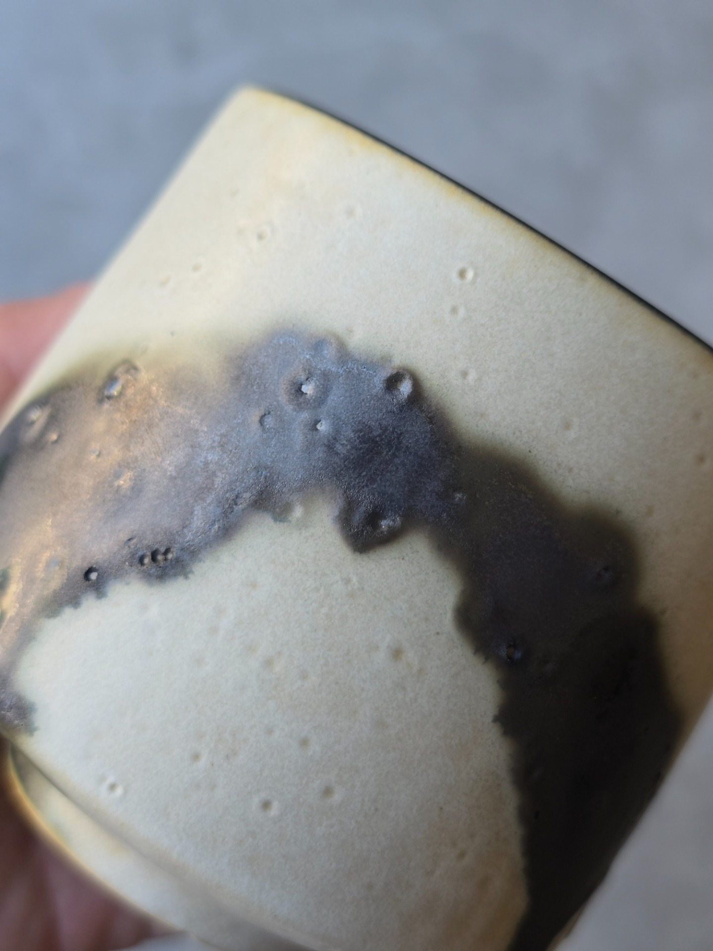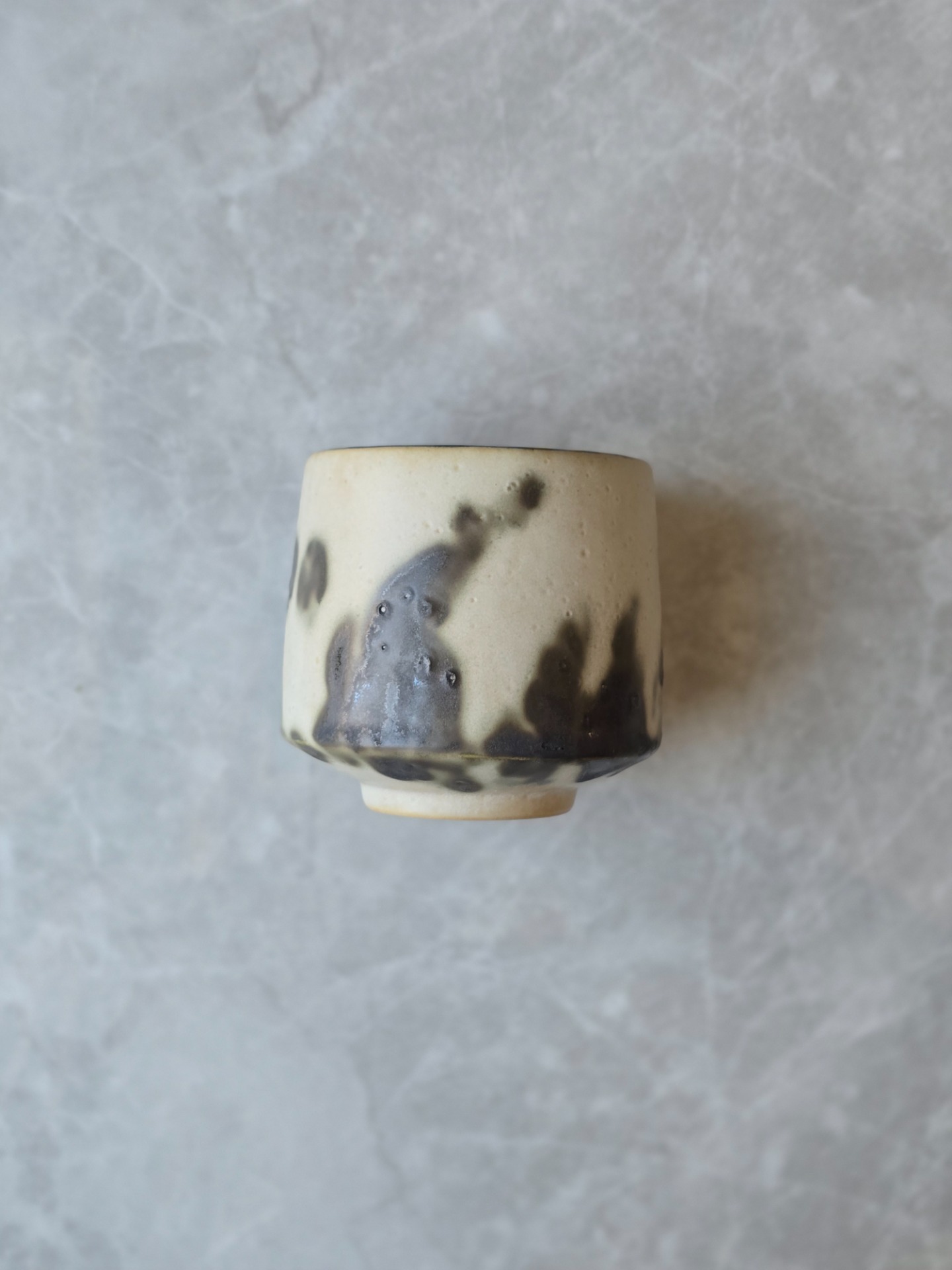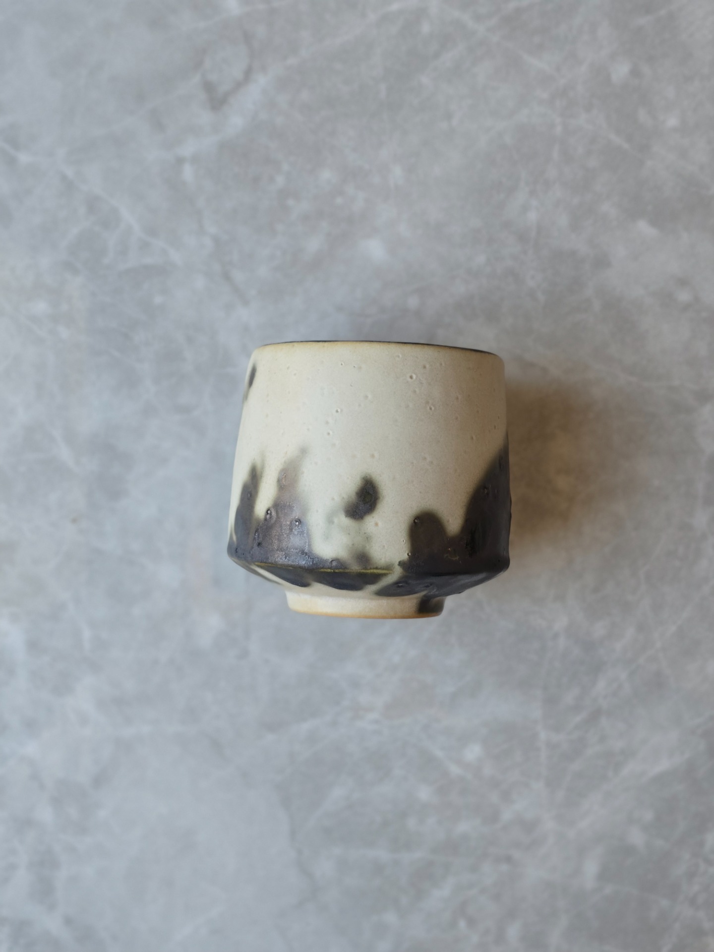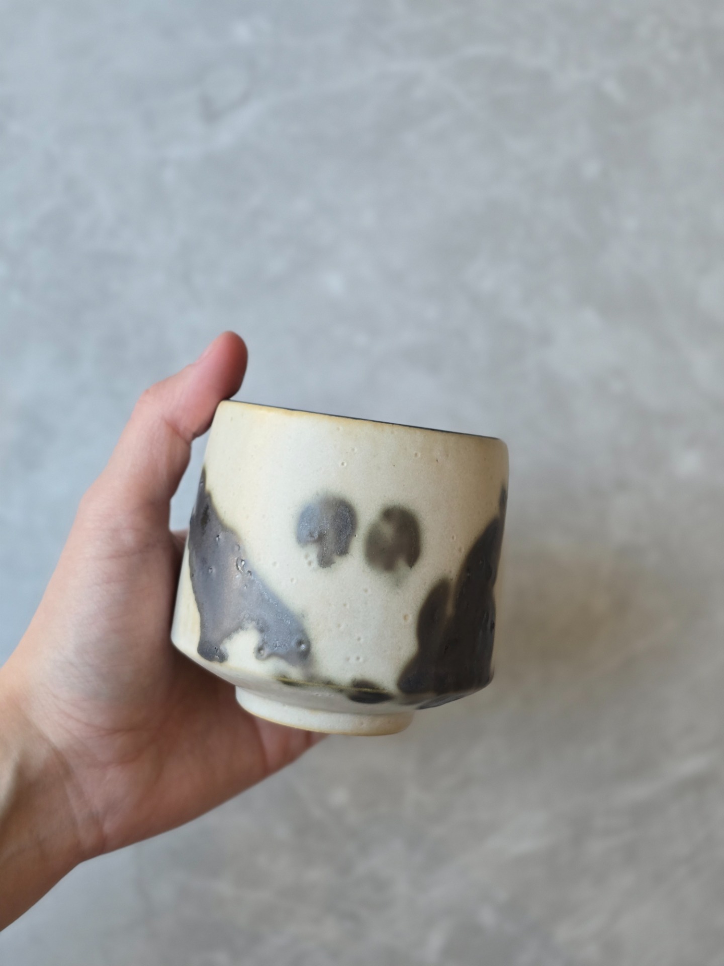 Varje kopp får sin egen personlighet - lite ojämn, lite oväntad men alldeles egen. Glasyren rör sig mellan blankt och matt, ljus och mörker. Utsidan är inte helt slät utan bär små ojämnheter. Insidan är mattsvart.