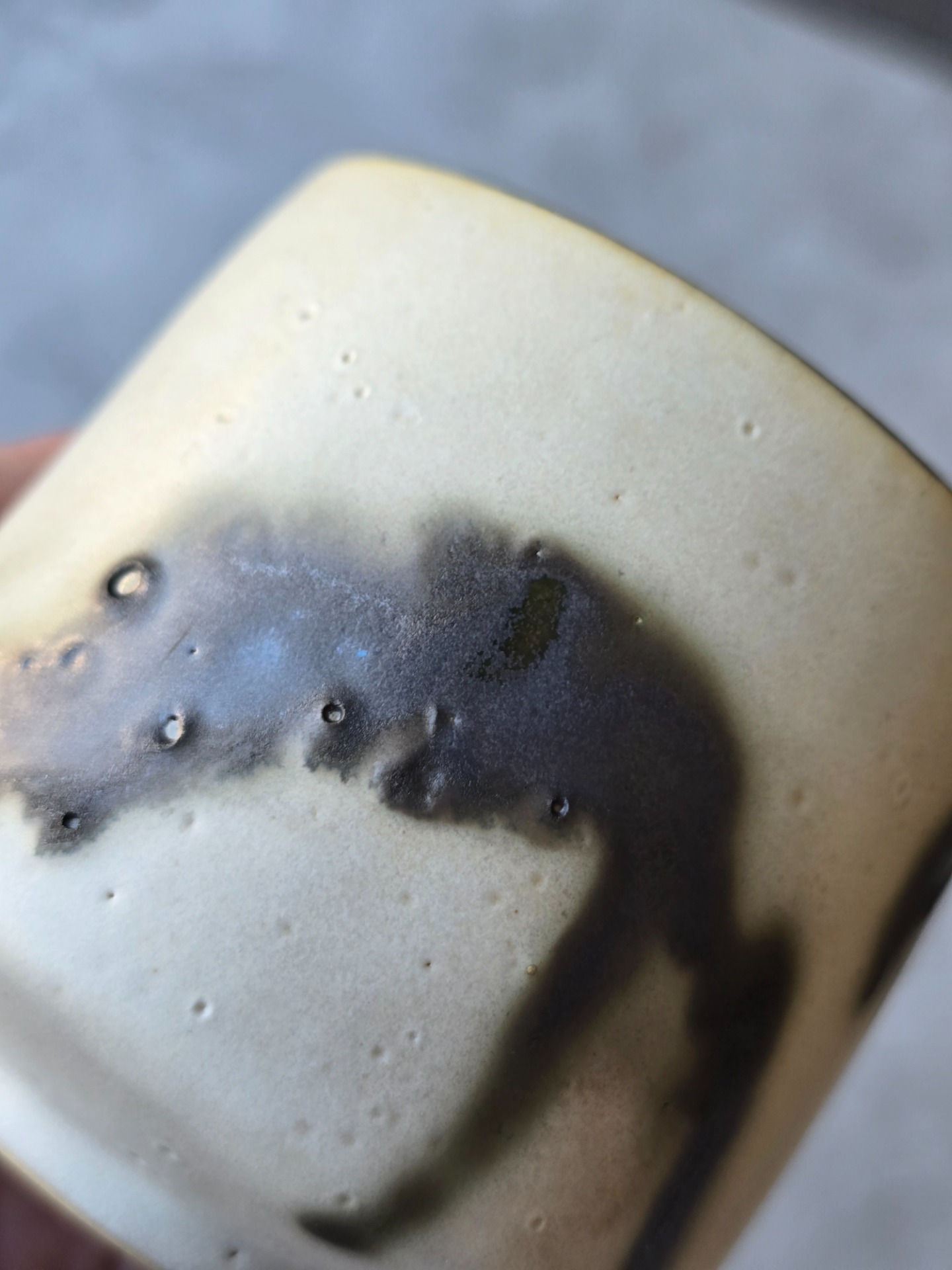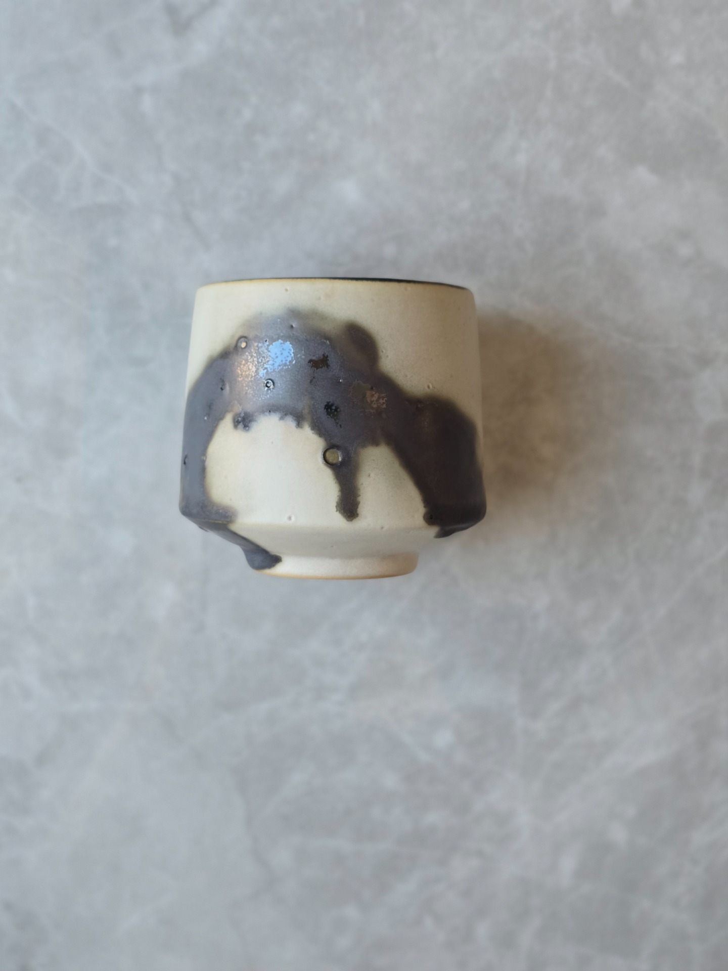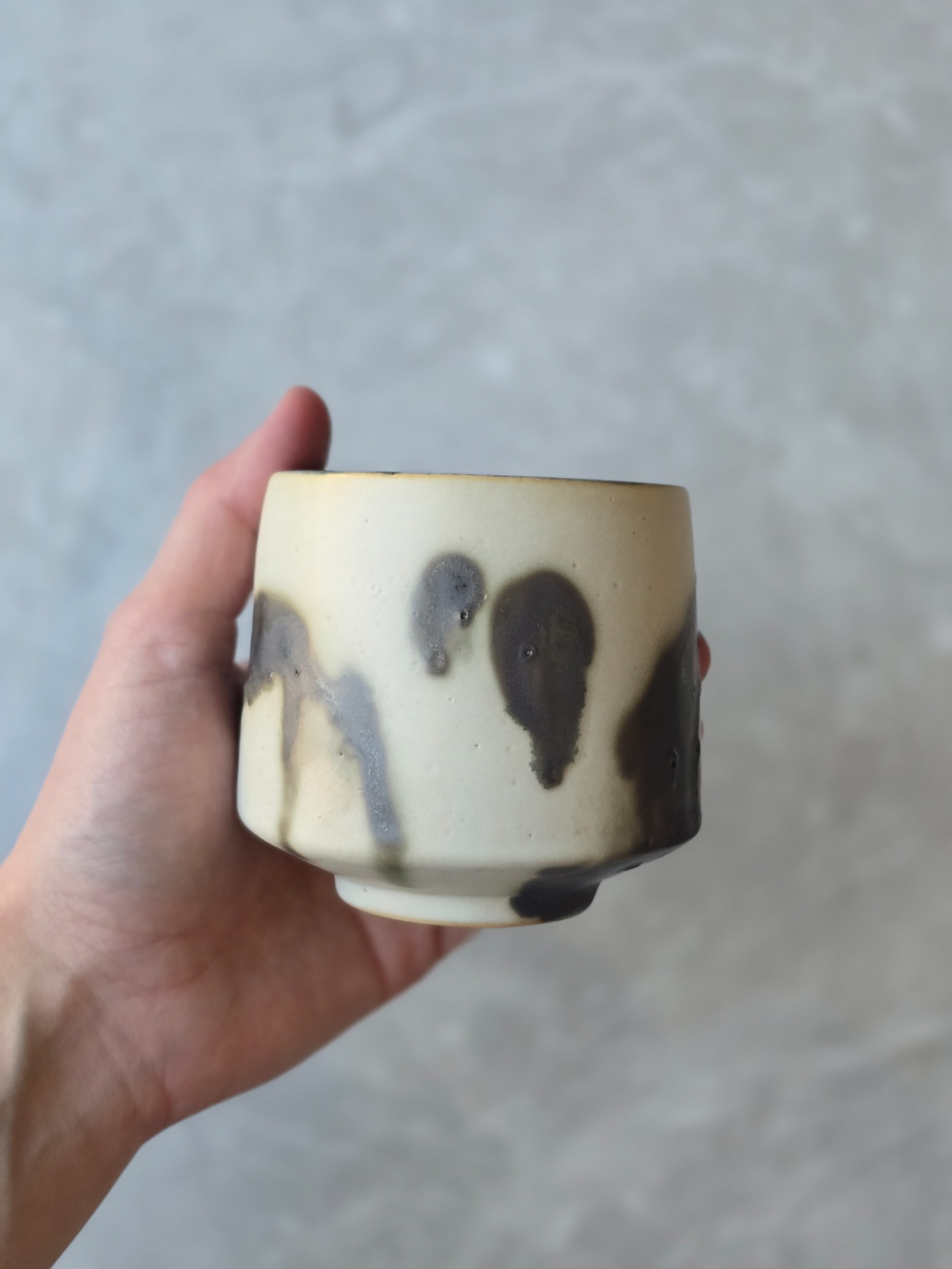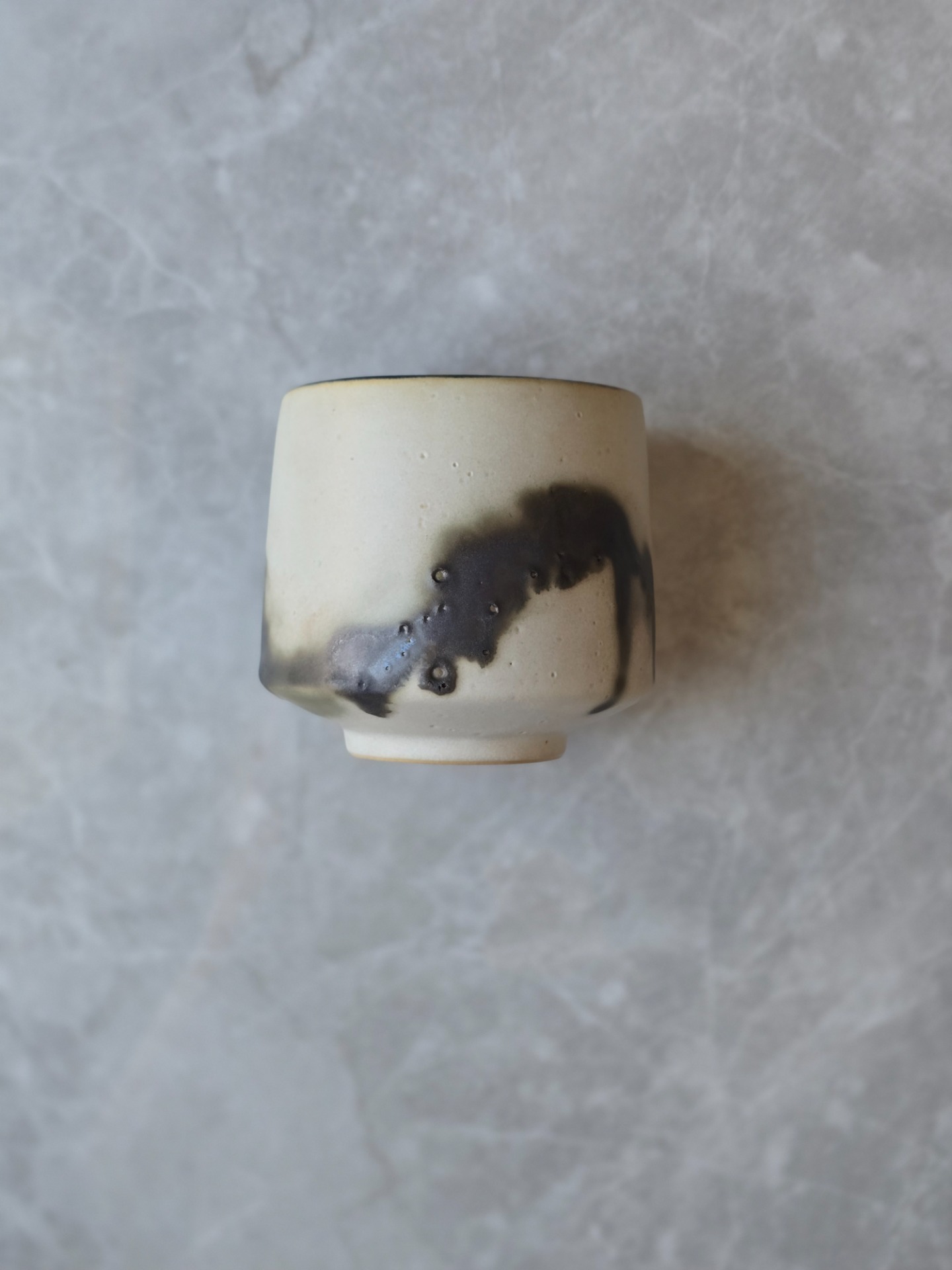 Varje kopp får sin egen personlighet - lite ojämn, lite oväntad men alldeles egen. Glasyren rör sig mellan blankt och matt, ljus och mörker. Utsidan är inte helt slät utan bär små ojämnheter. Insidan är mattsvart.