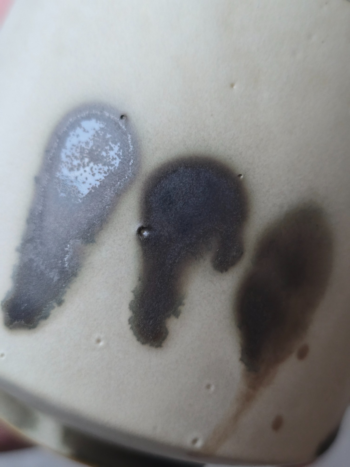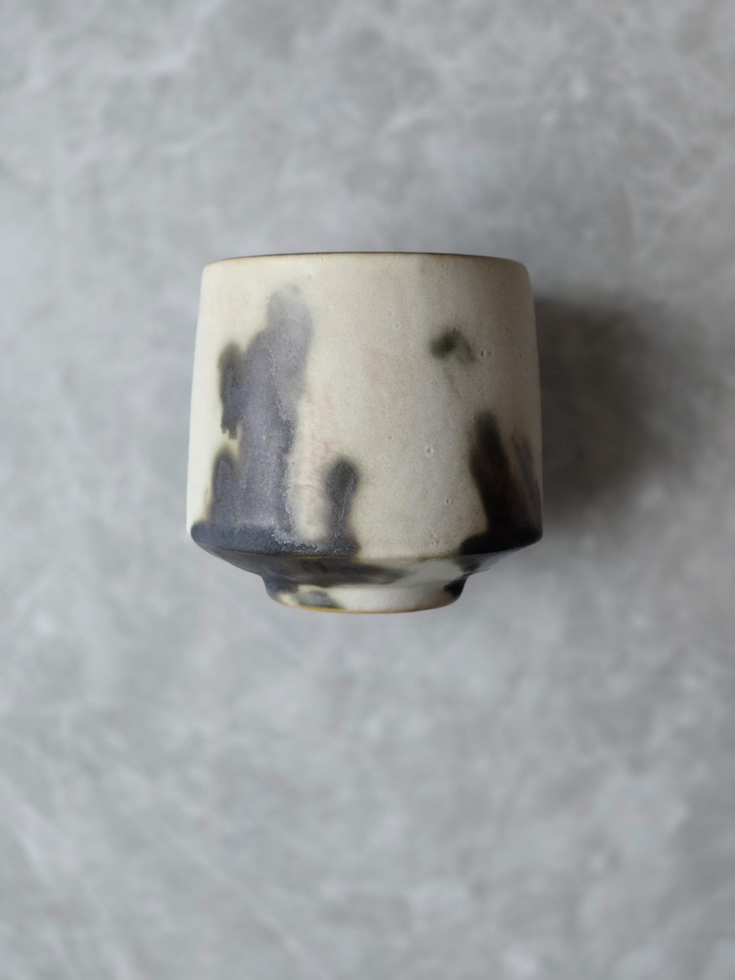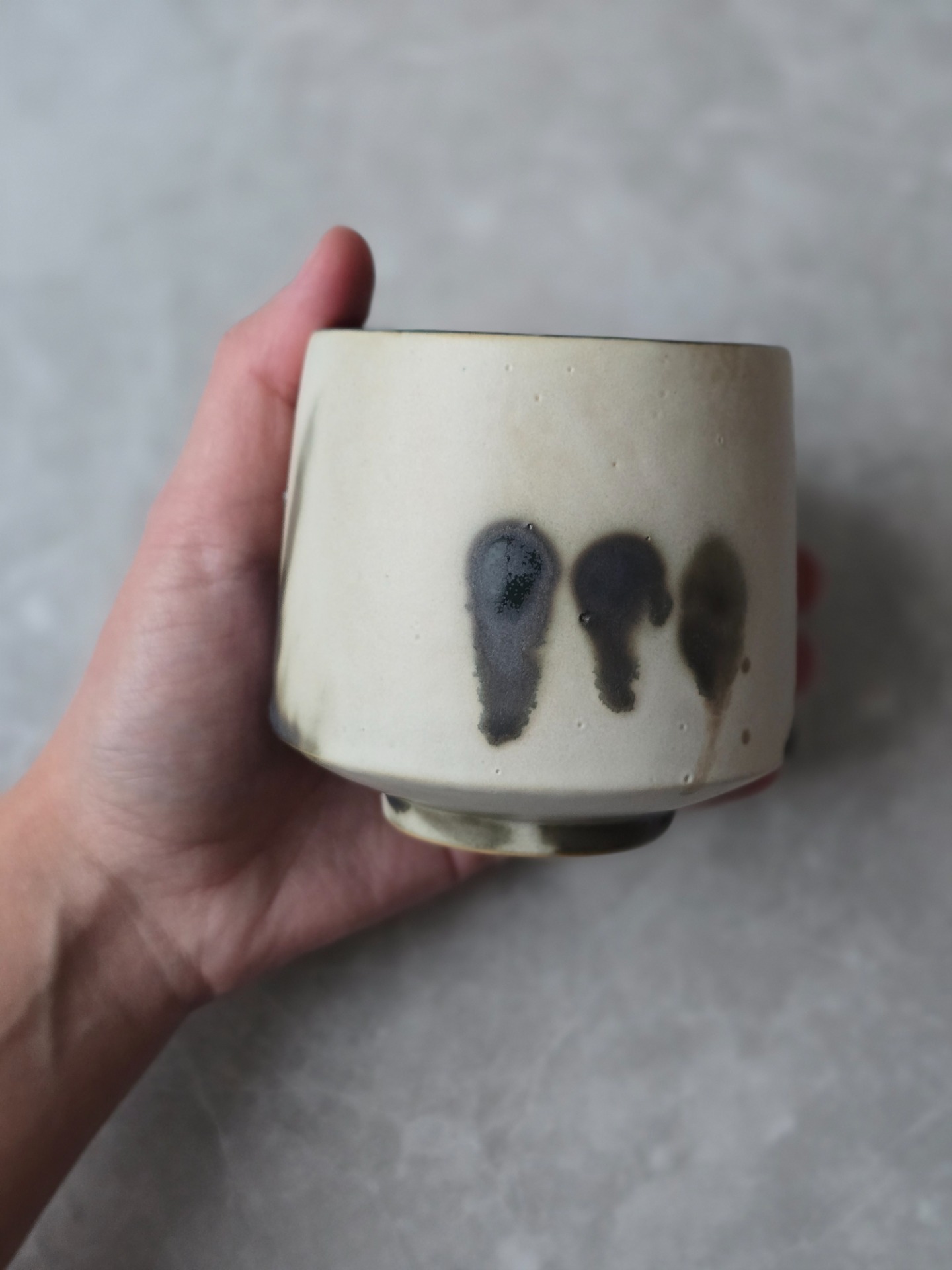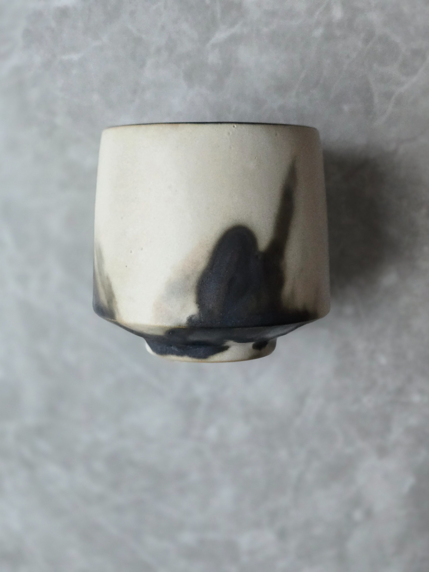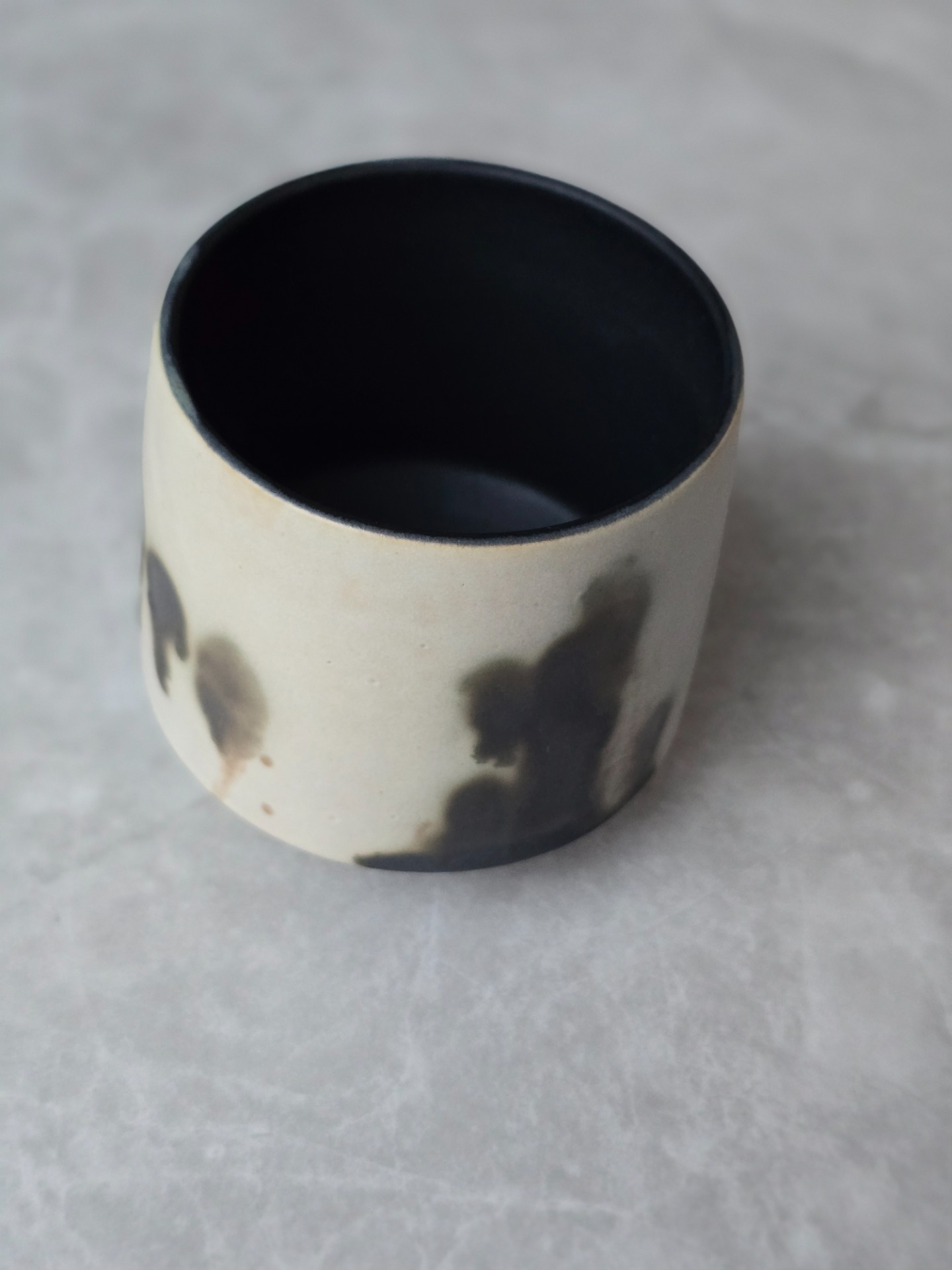 Varje kopp får sin egen personlighet - lite ojämn, lite oväntad men alldeles egen. Glasyren rör sig mellan blankt och matt, ljus och mörker. Utsidan är inte helt slät utan bär små ojämnheter.