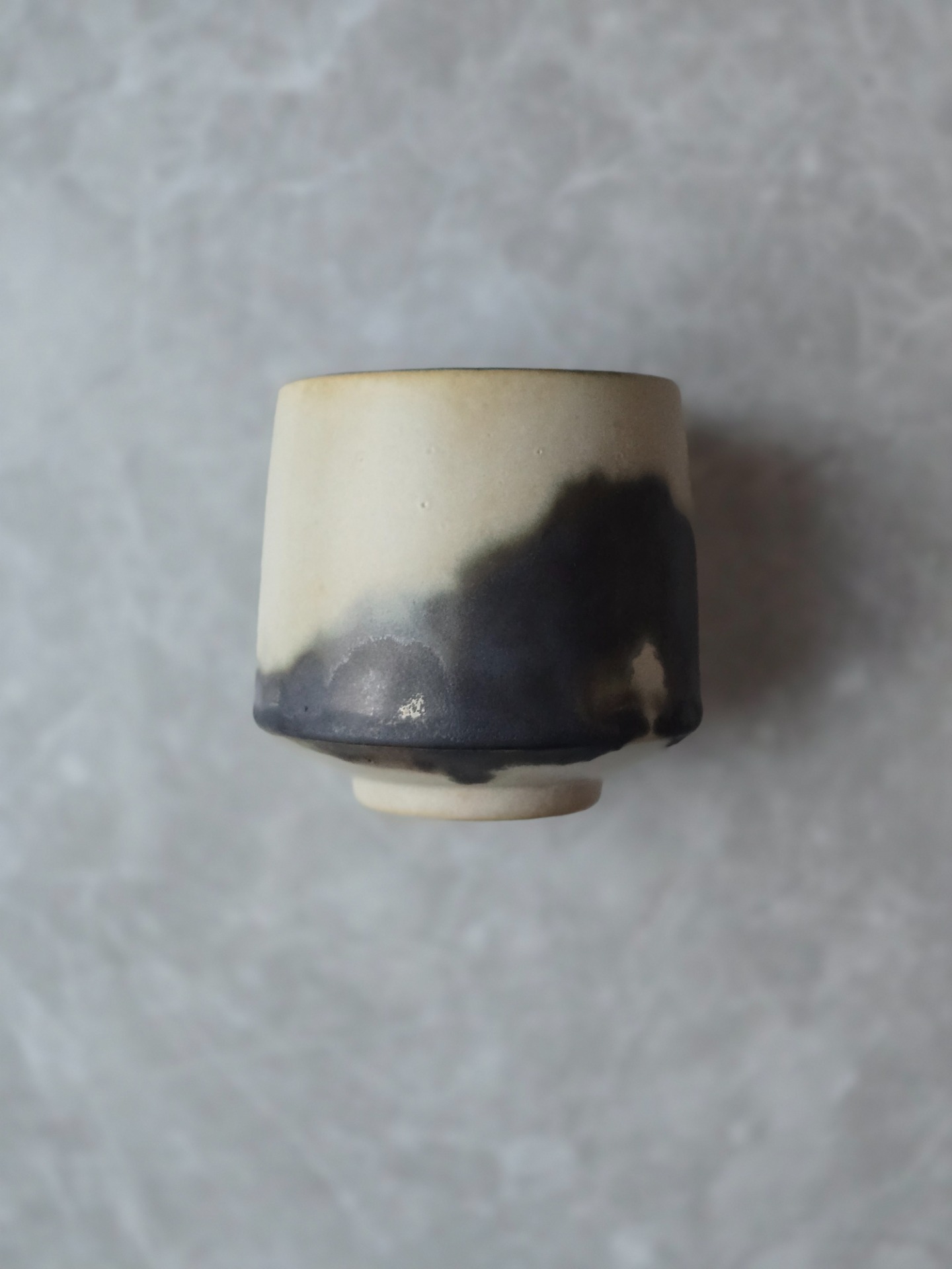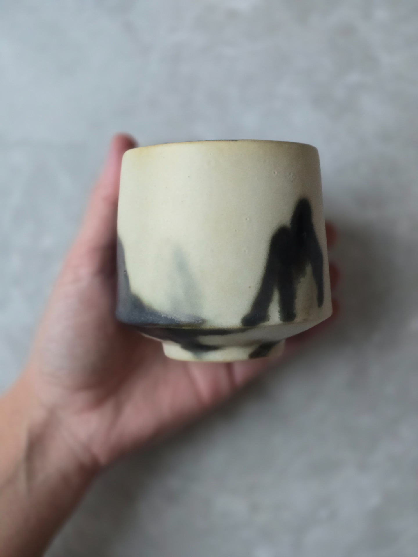 Varje kopp får sin egen personlighet - lite ojämn, lite oväntad men alldeles egen. Glasyren rör sig mellan blankt och matt, ljus och mörker. Utsidan är inte helt slät utan bär små ojämnheter.