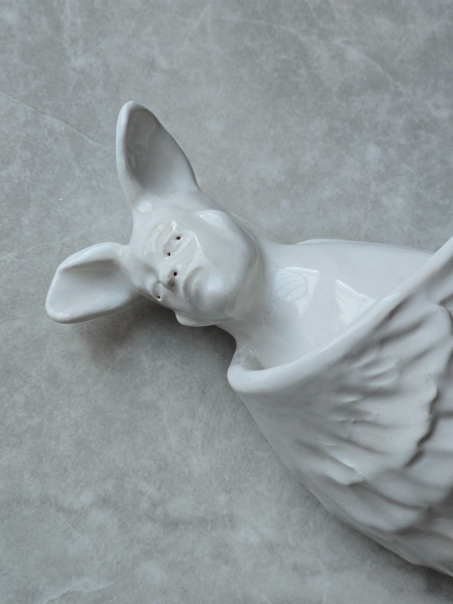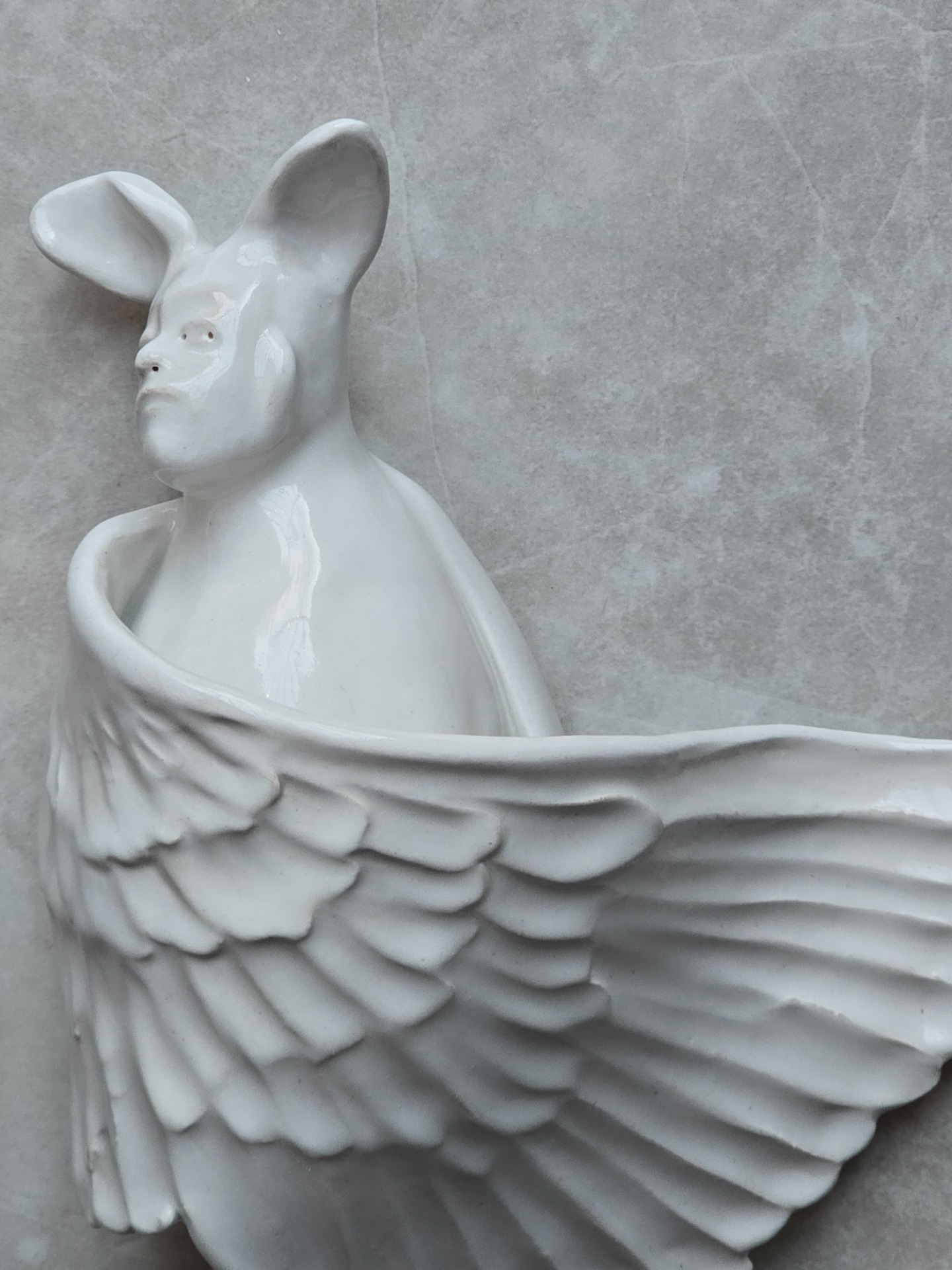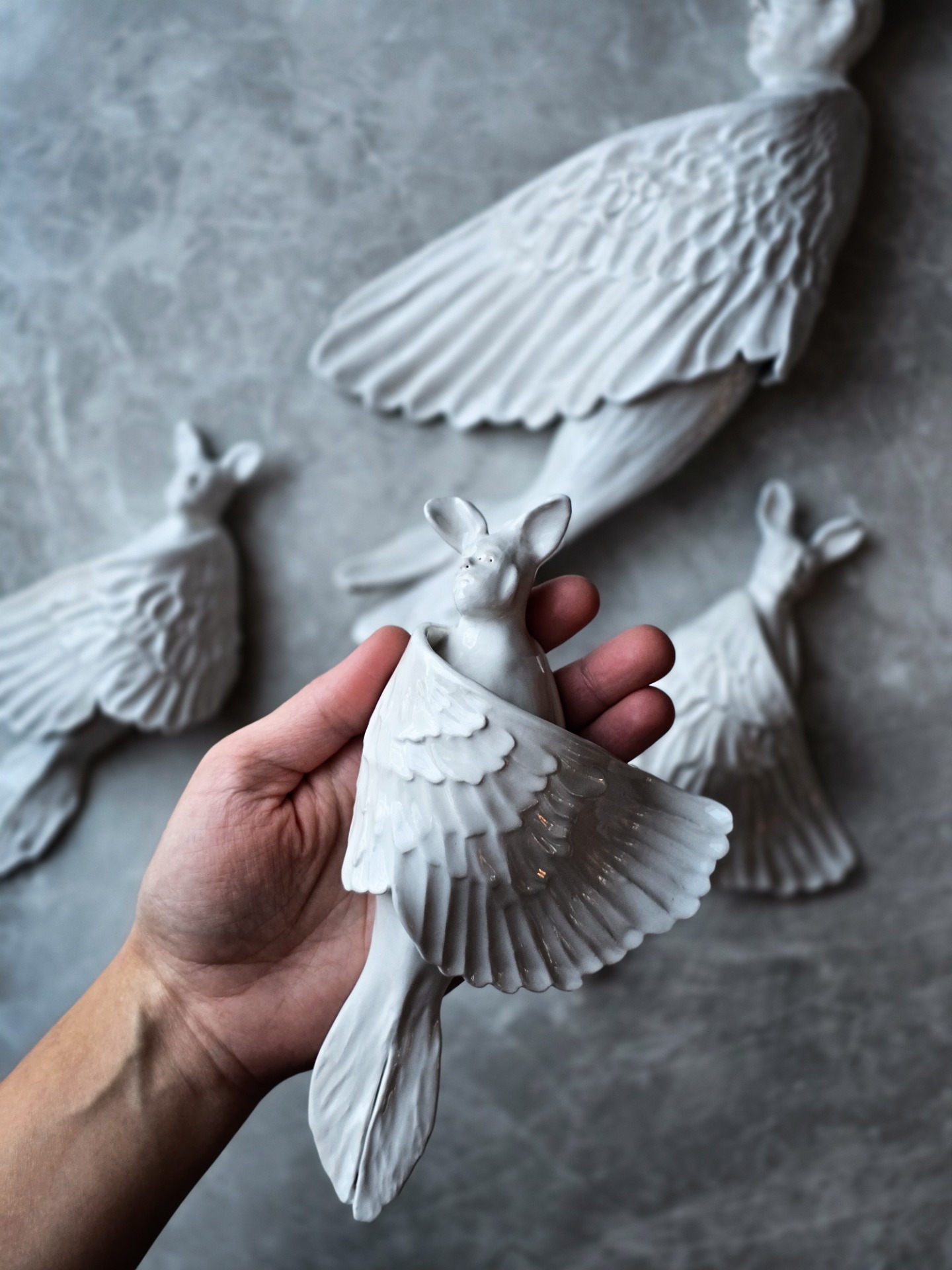 Människofåglar – stillsamma väsen som rör sig någonstans mellan människa och fågel. Varje vägghängd skulptur är varsamt formad och klädd i en vit, blank glasyr som fångar ljuset och ger liv åt ytan. De tar inte stor plats, men de vill gärna bli sedda – som en tyst påminnelse om skörhet, frihet och det som binder oss samman.
