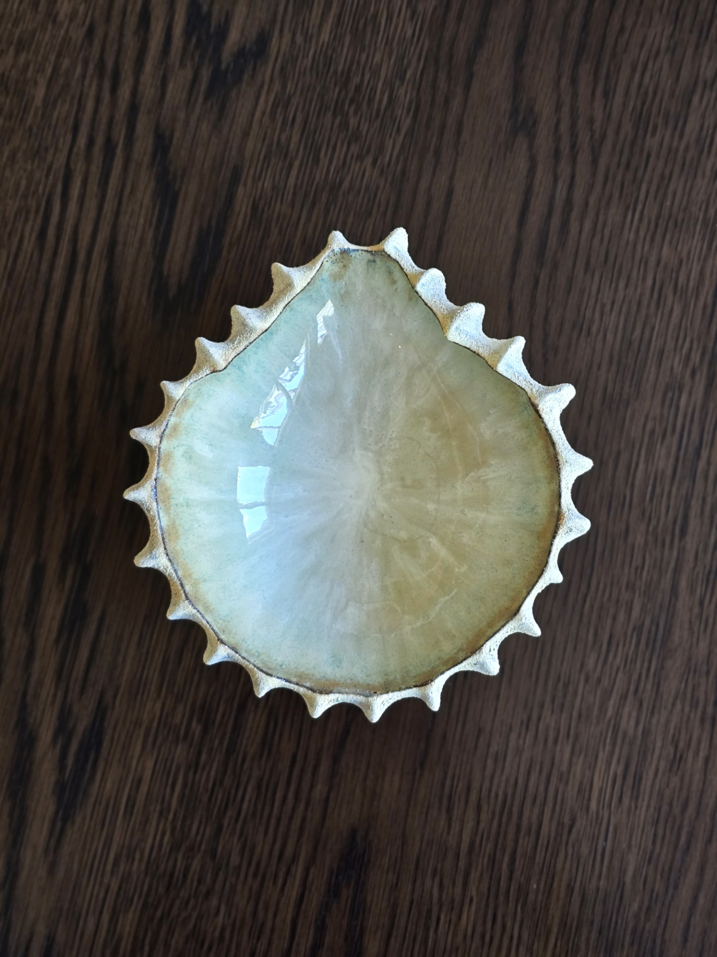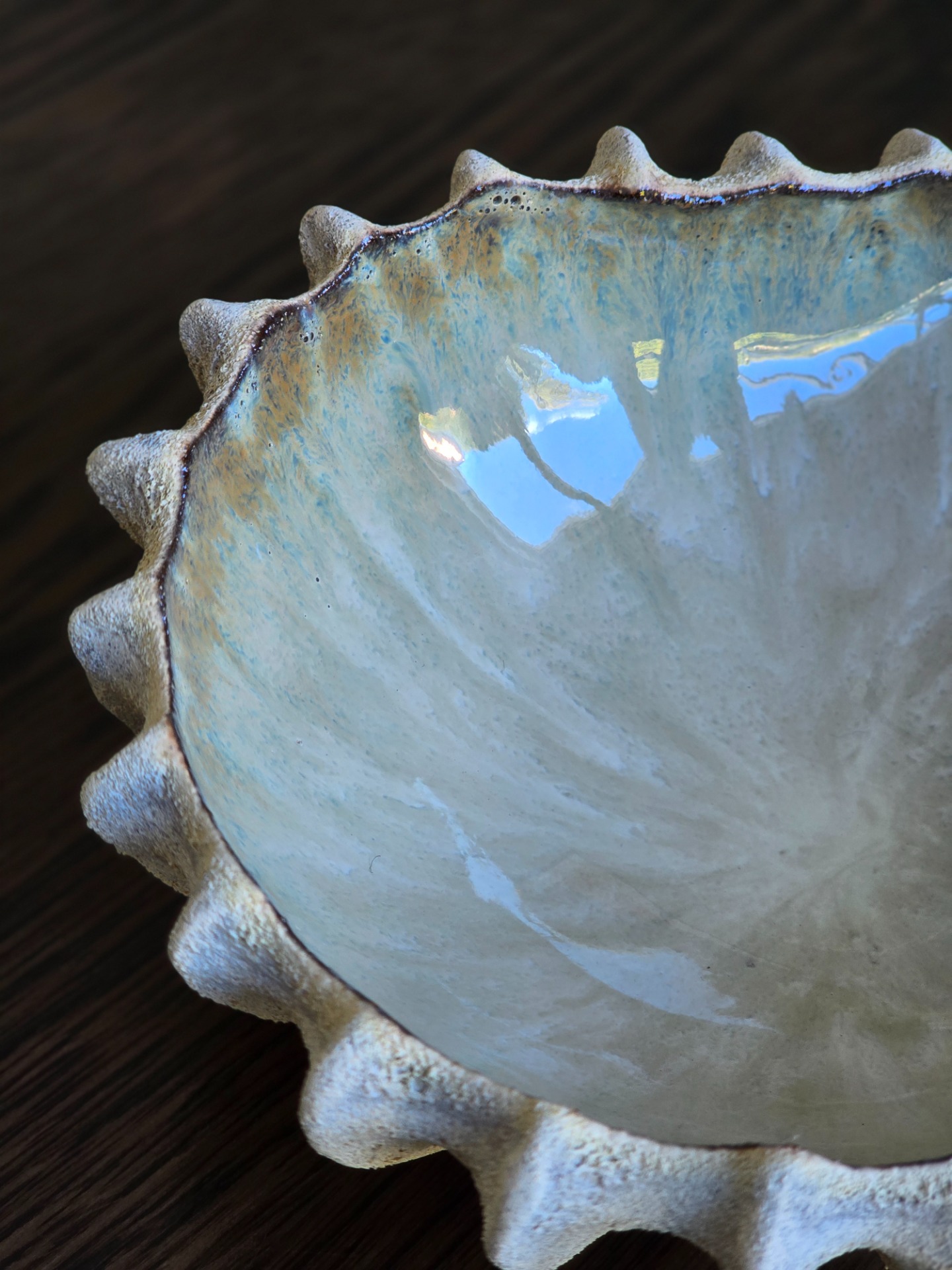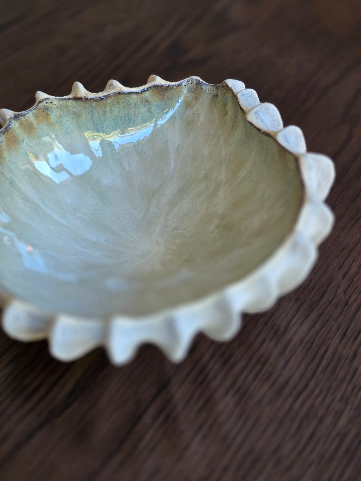 Handgjord skål i återbrukad, brunsvart lera. Glaserad i en vaniljbeige lavaglasyr som ger struktur. Insidan är glaserad i en blank glasyr som skiftar i gröna och beiga toner.
