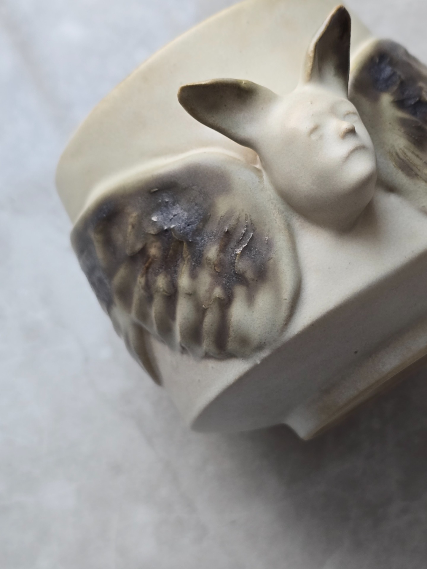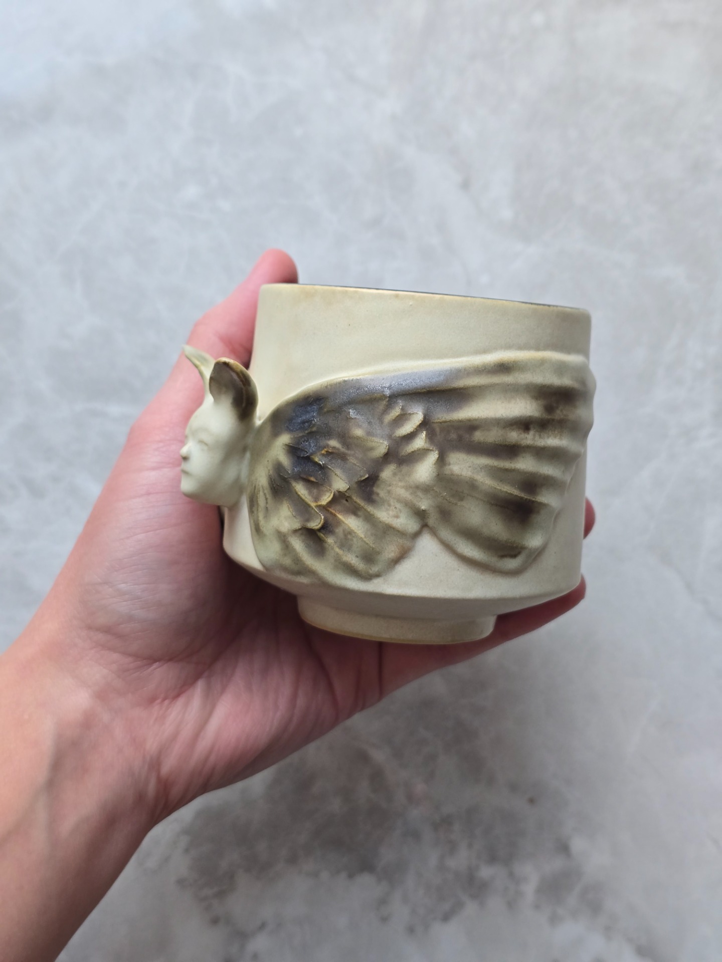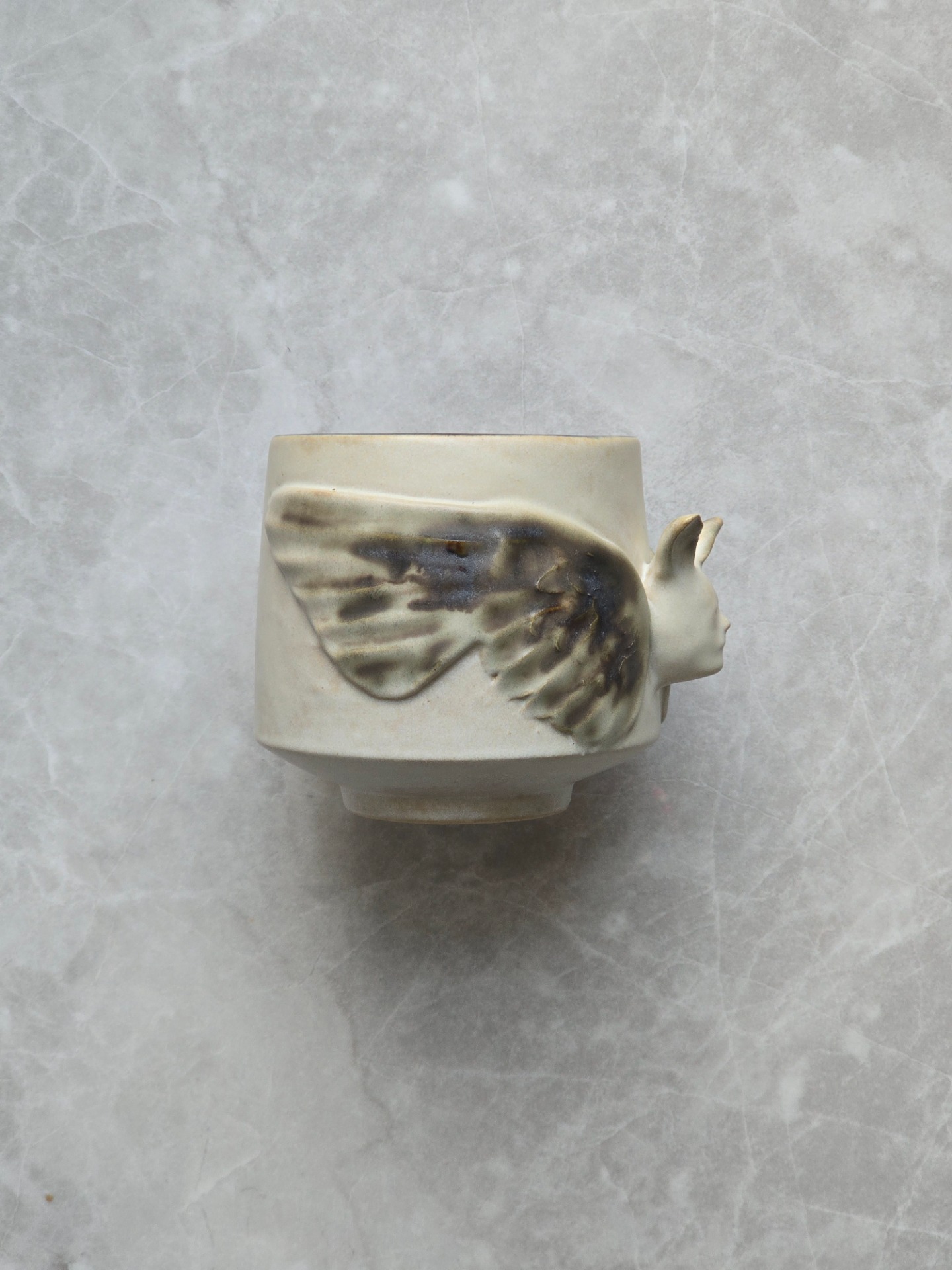 Varje kopp bär sin egen varelse. Glasyren rör sig mellan blankt och matt, mellan ljus och mörker. Utsidan är inte helt slät, utan bär små ojämnheter som ger liv och karaktär. Insidan är glaserad i en mattsvart nyans.