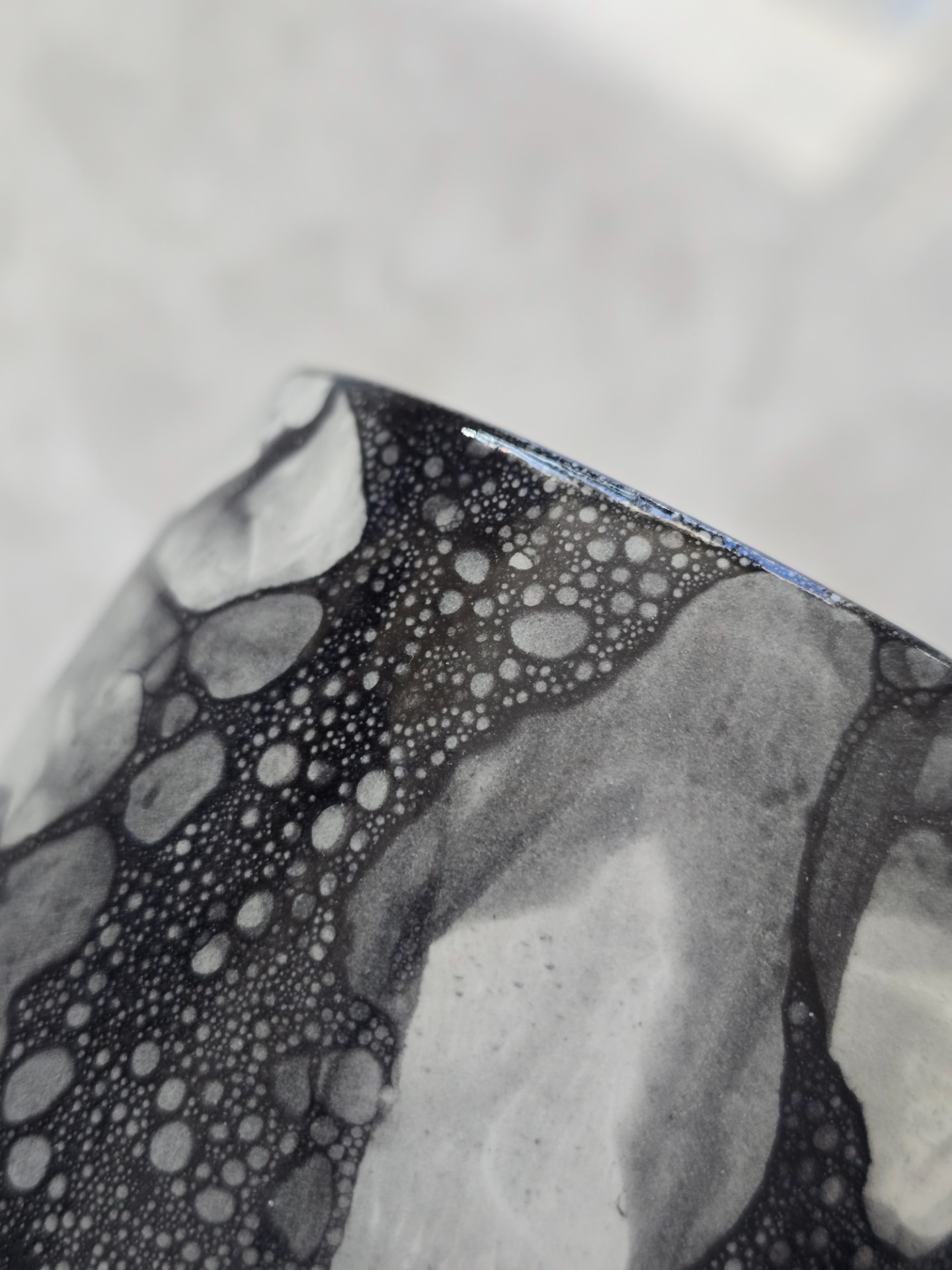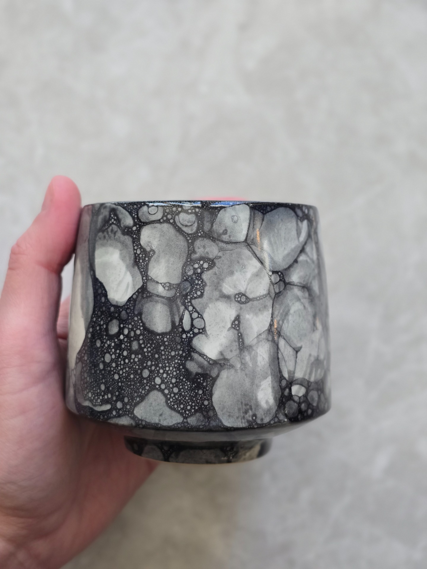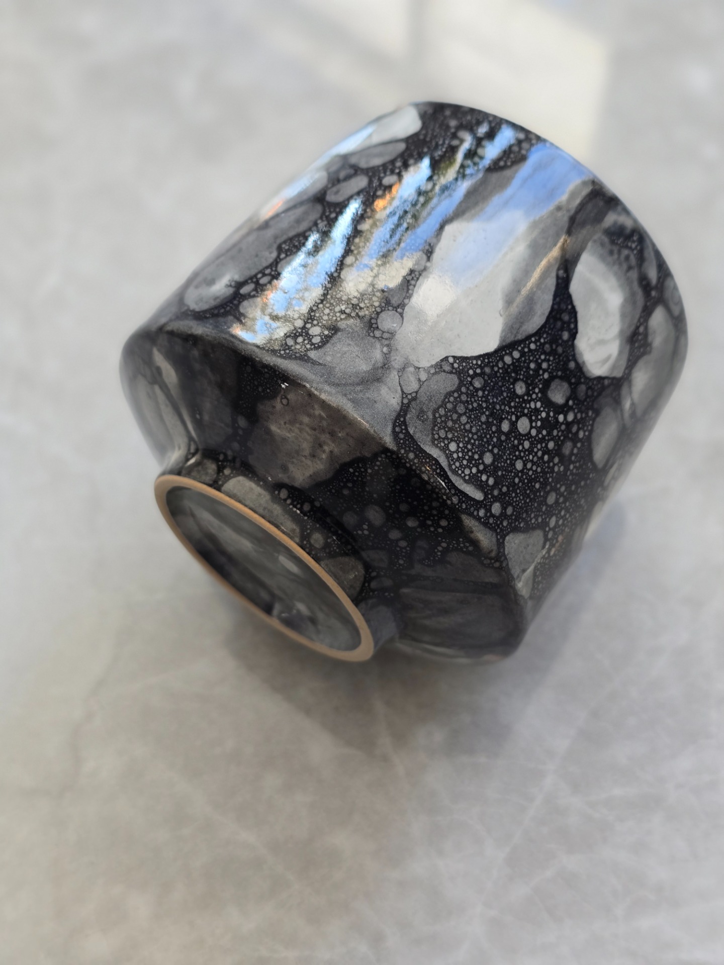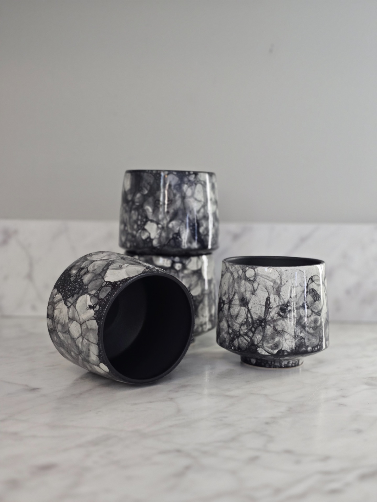 Utsidan är blank och insidan bär en svart, matt glasyr. Observera att varje kopp är unik och att variationer i mönstret förekommer som en naturlig del av det mänskliga hantverket.