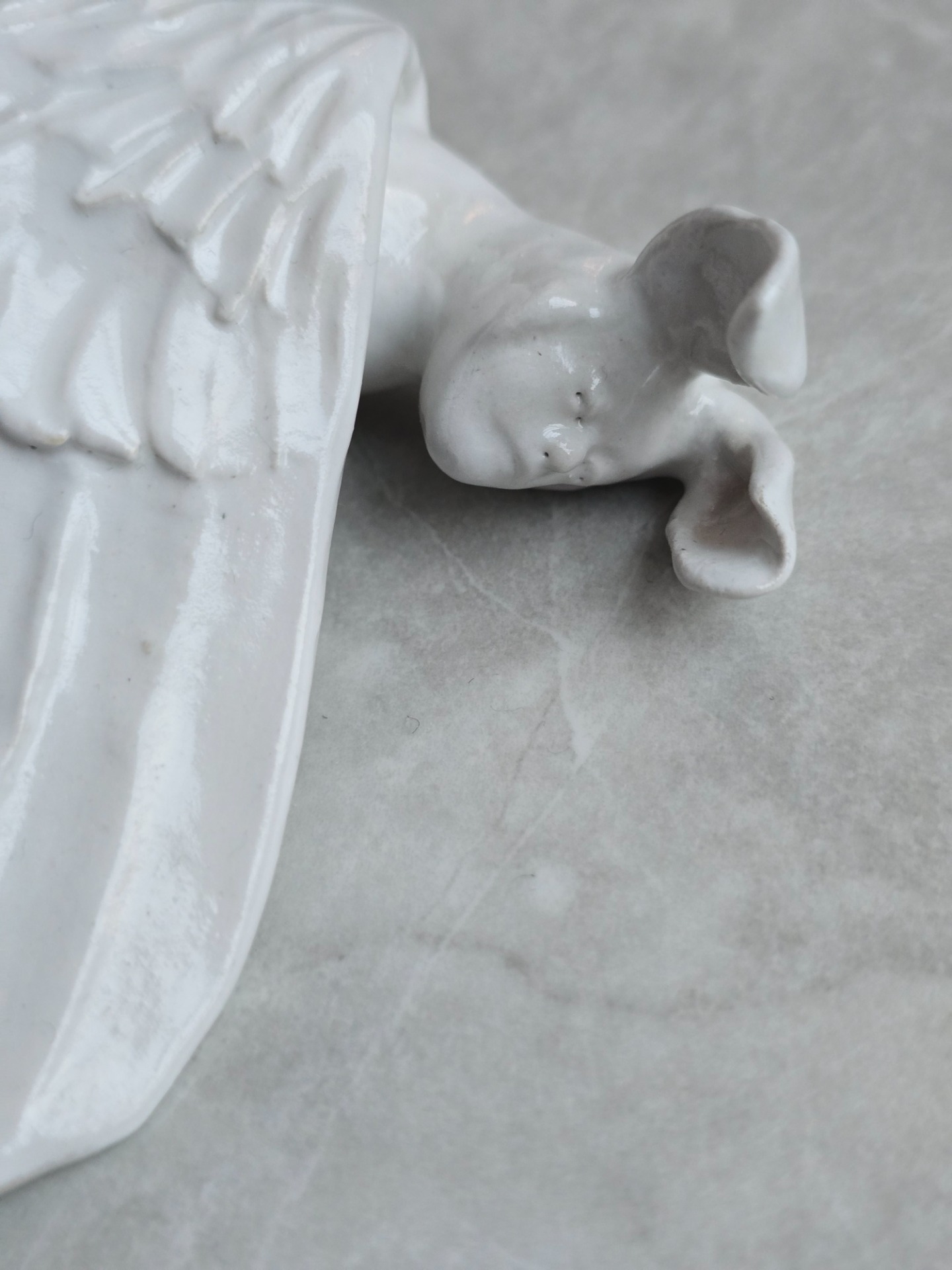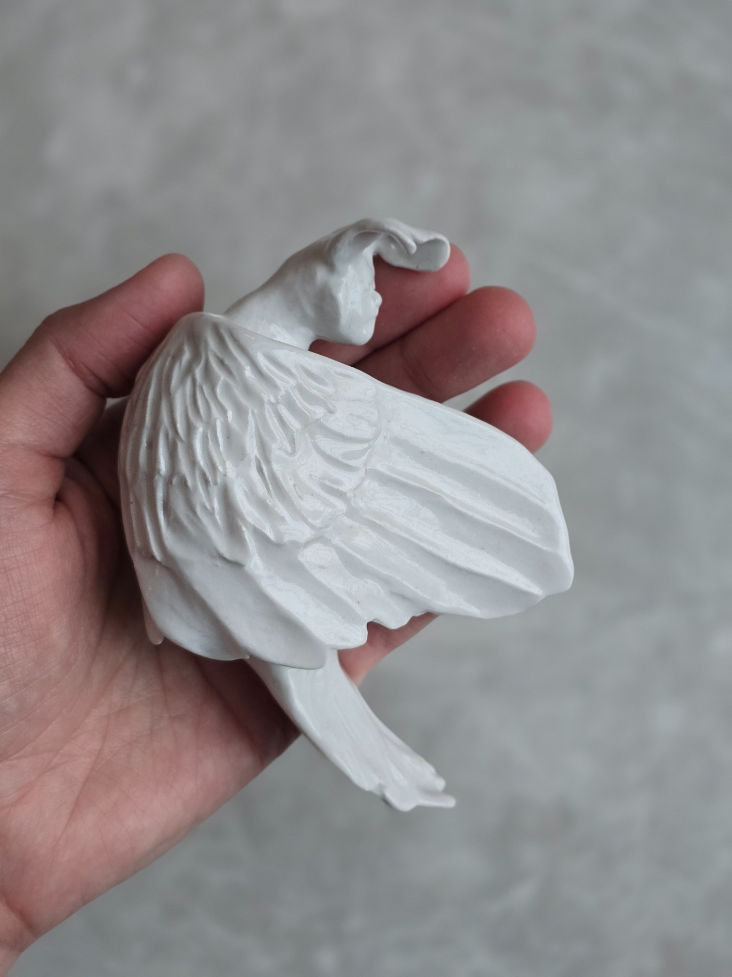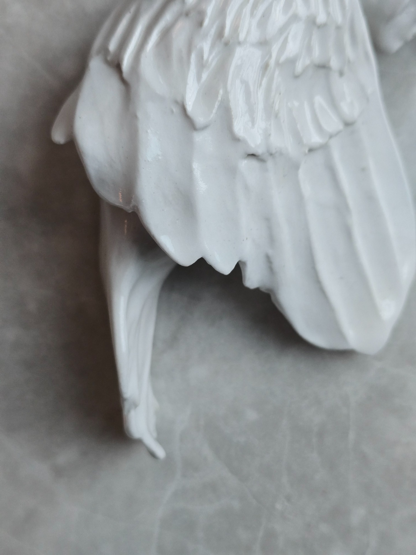 Människofåglar – stillsamma väsen som rör sig någonstans mellan människa och fågel. Varje vägghängd skulptur är varsamt formad och klädd i en vit, blank glasyr som fångar ljuset och ger liv åt ytan. De tar inte stor plats, men de vill gärna bli sedda – som en tyst påminnelse om skörhet, frihet och det som binder oss samman.