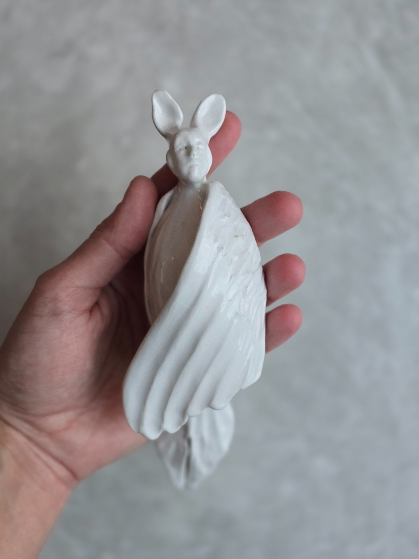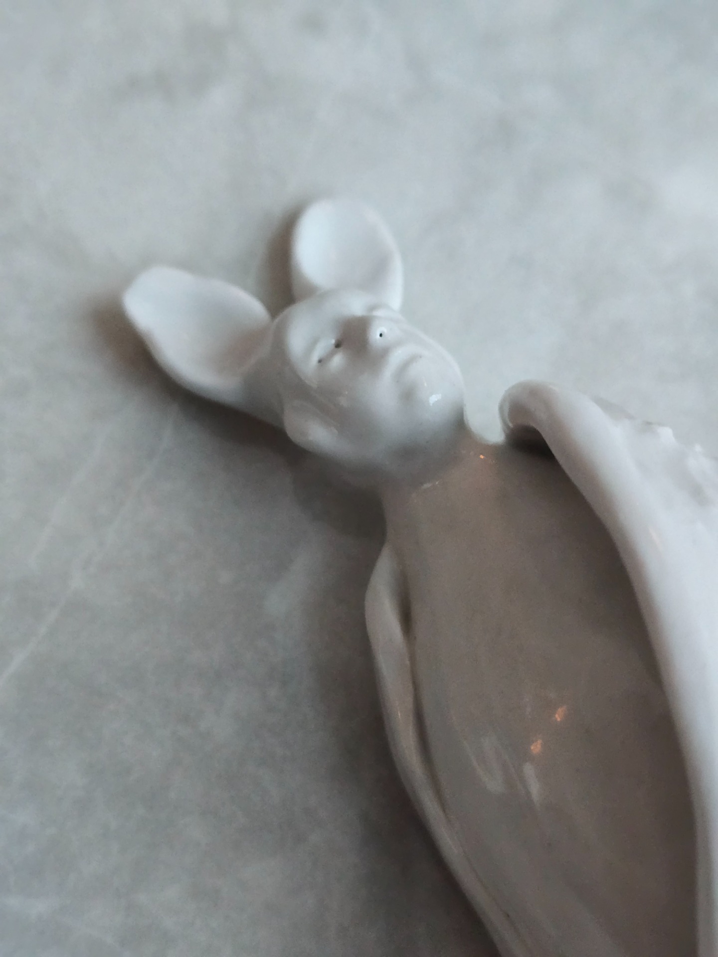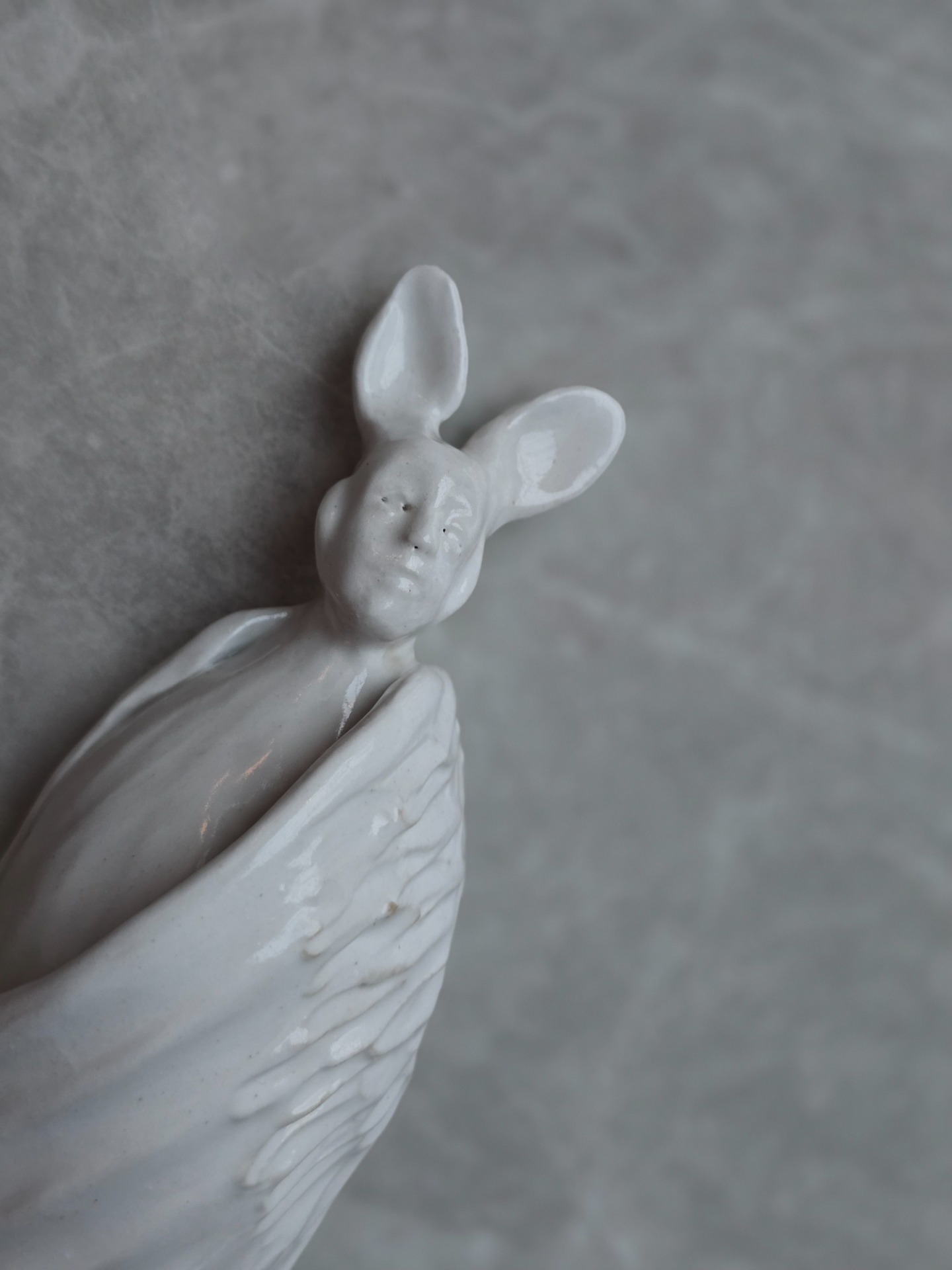 Människofåglar – stillsamma väsen som rör sig någonstans mellan människa och fågel. Varje vägghängd skulptur är varsamt formad och klädd i en vit, blank glasyr som fångar ljuset och ger liv åt ytan. De tar inte stor plats, men de vill gärna bli sedda – som en tyst påminnelse om skörhet, frihet och det som binder oss samman.