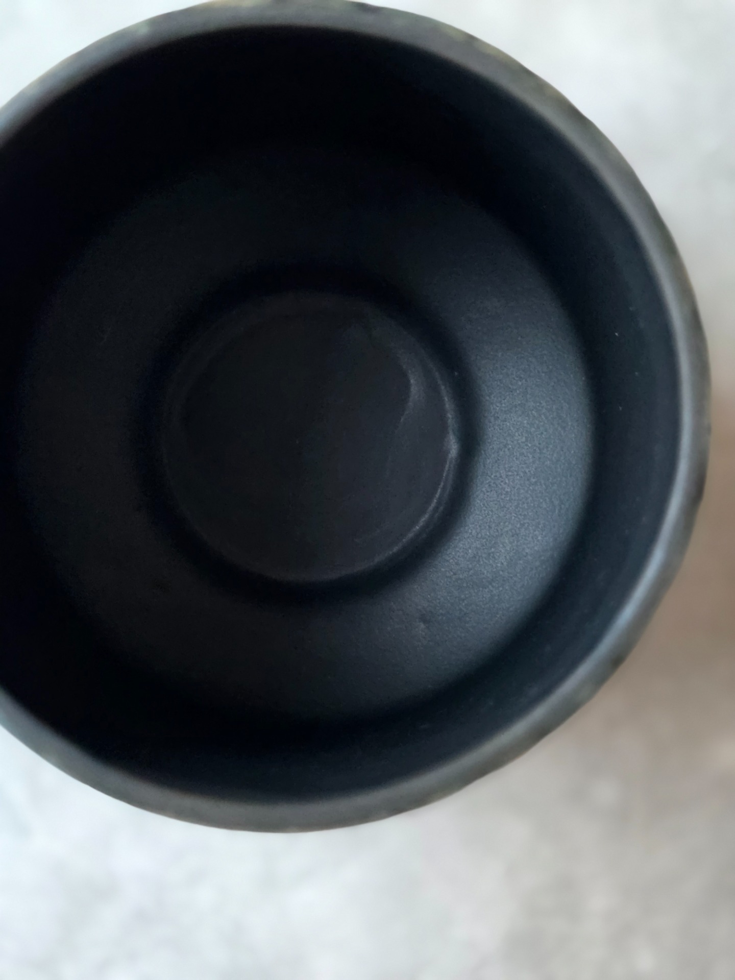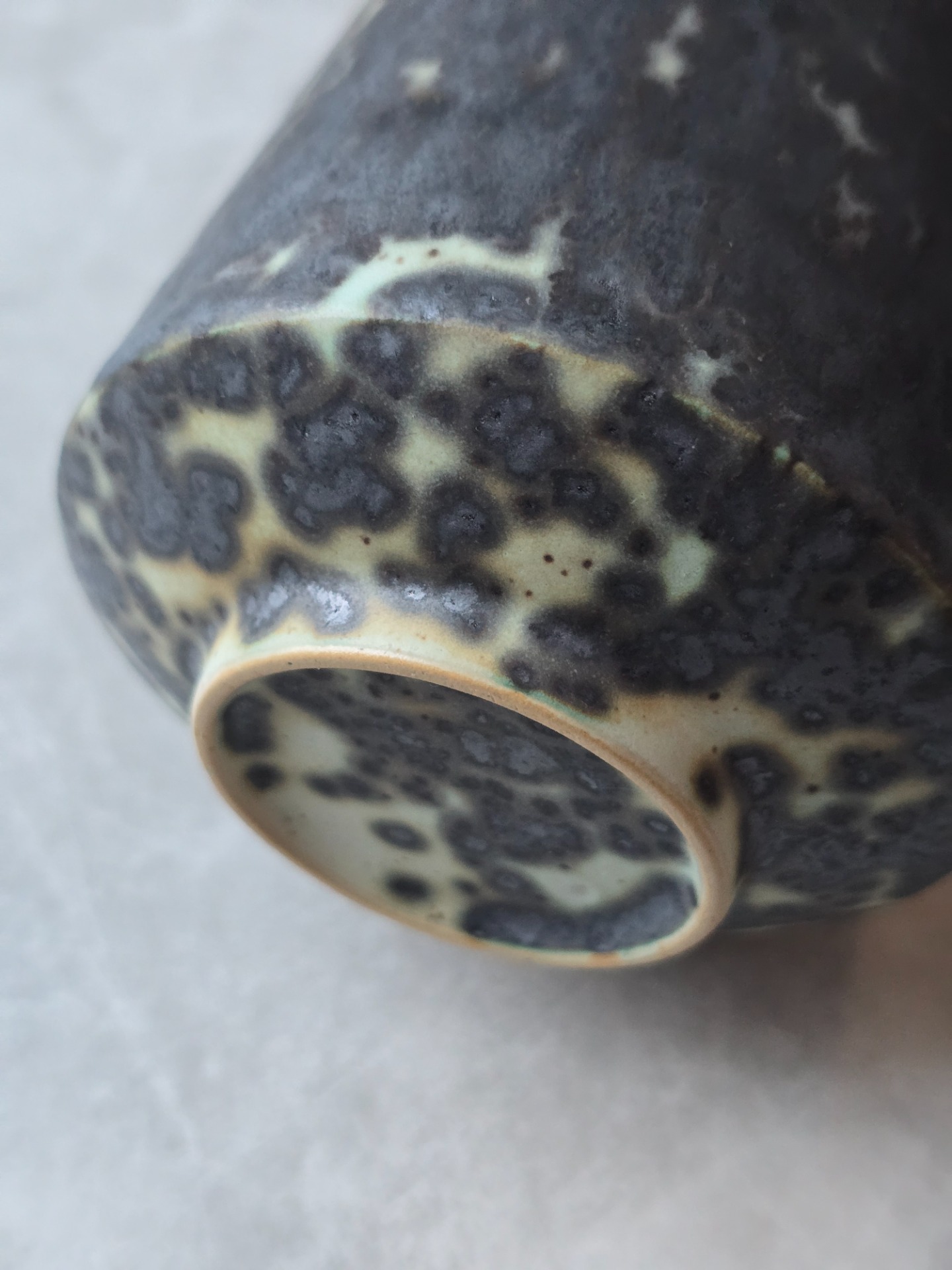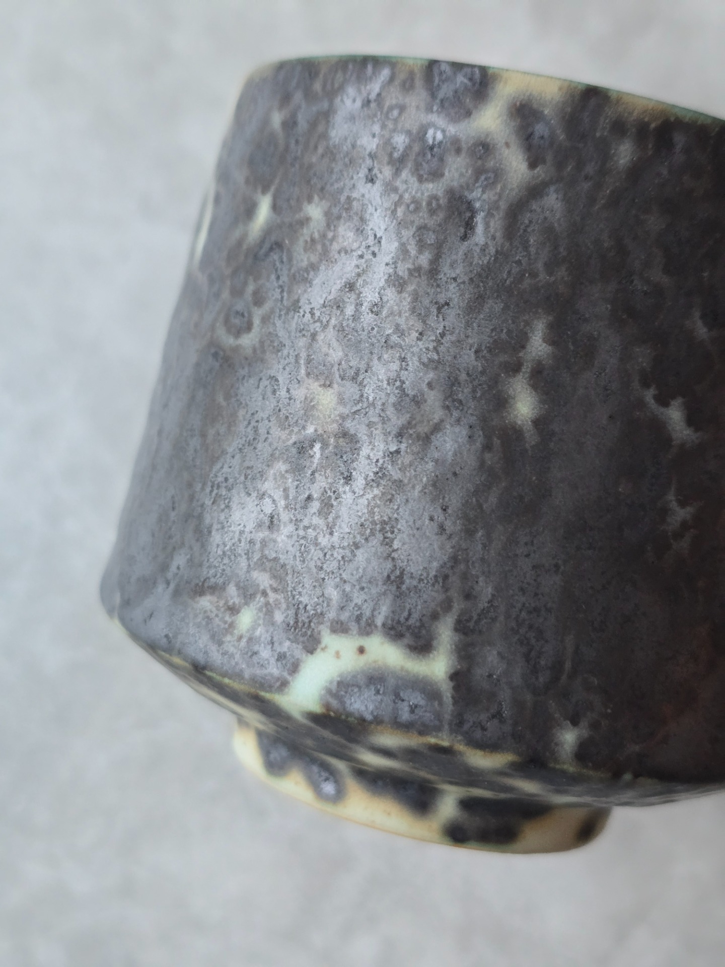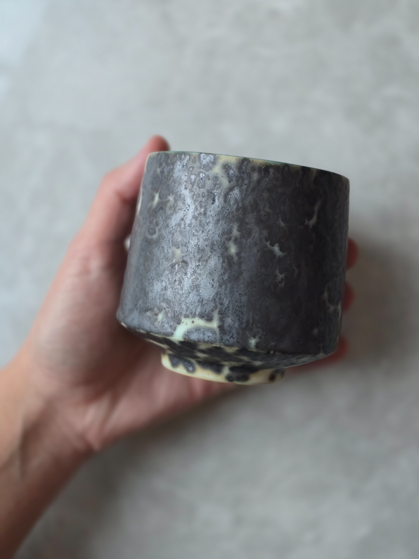 Varje kopp får sin egen personlighet - lite ojämn, lite oväntad men alldeles egen. Glasyren rör sig i gråblåa och grönbruna toner och påminner lite om blåmögelost.