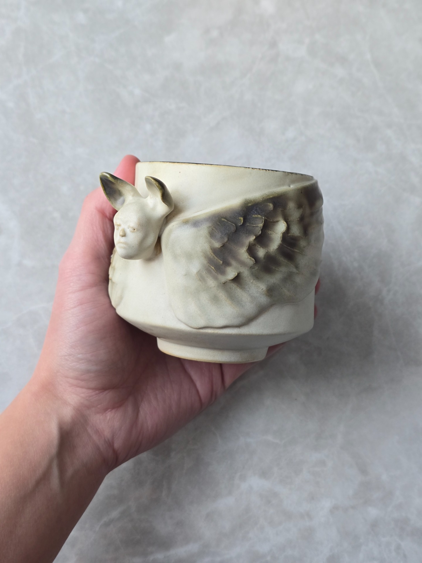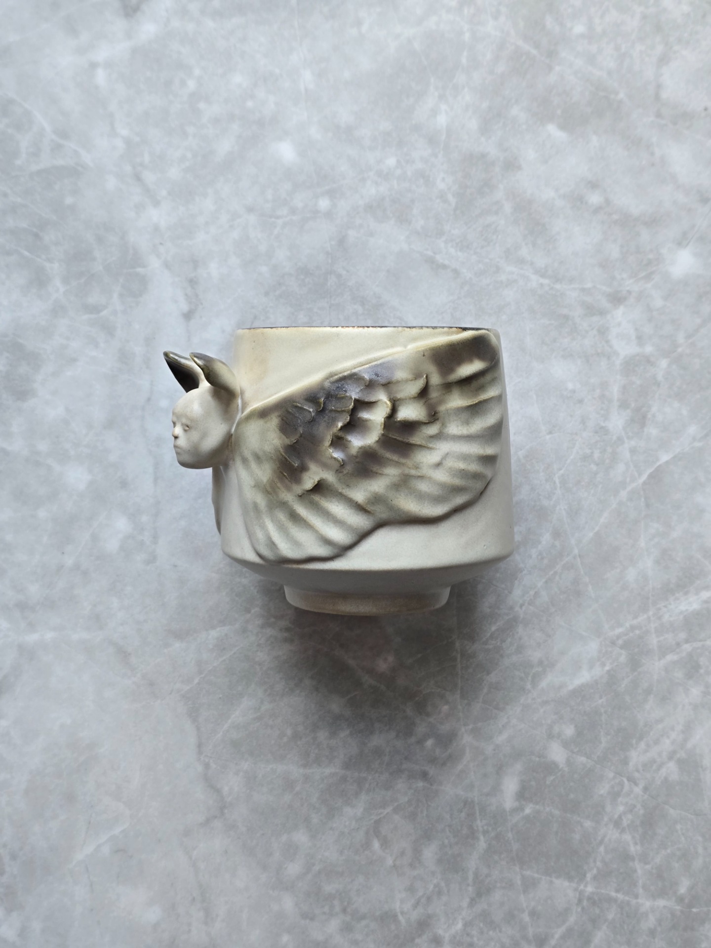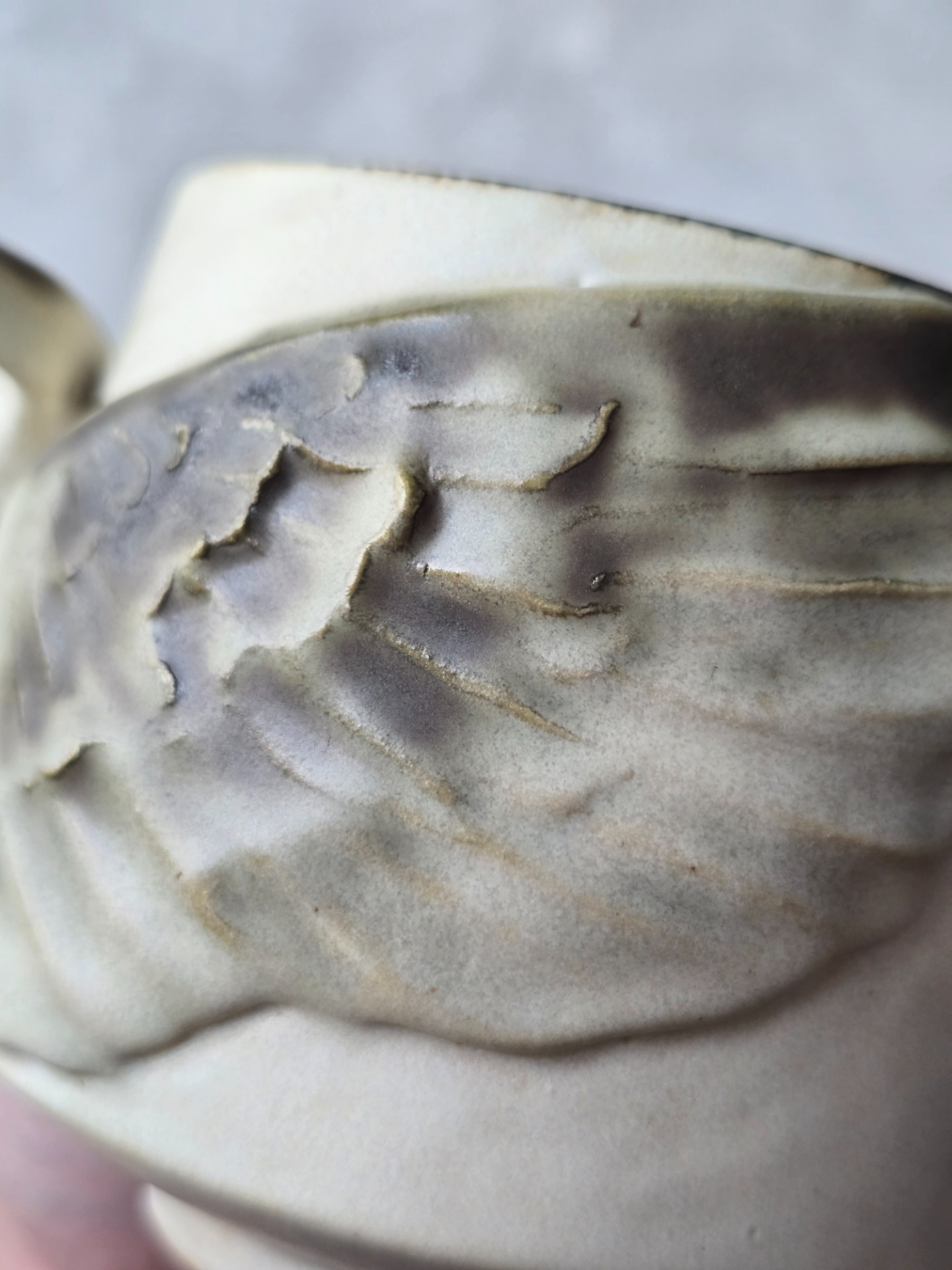 Varje kopp bär sin egen varelse. Glasyren rör sig mellan blankt och matt, mellan ljus och mörker. Utsidan är inte helt slät, utan bär små ojämnheter som ger liv och karaktär. Insidan är glaserad i en mattsvart nyans.
