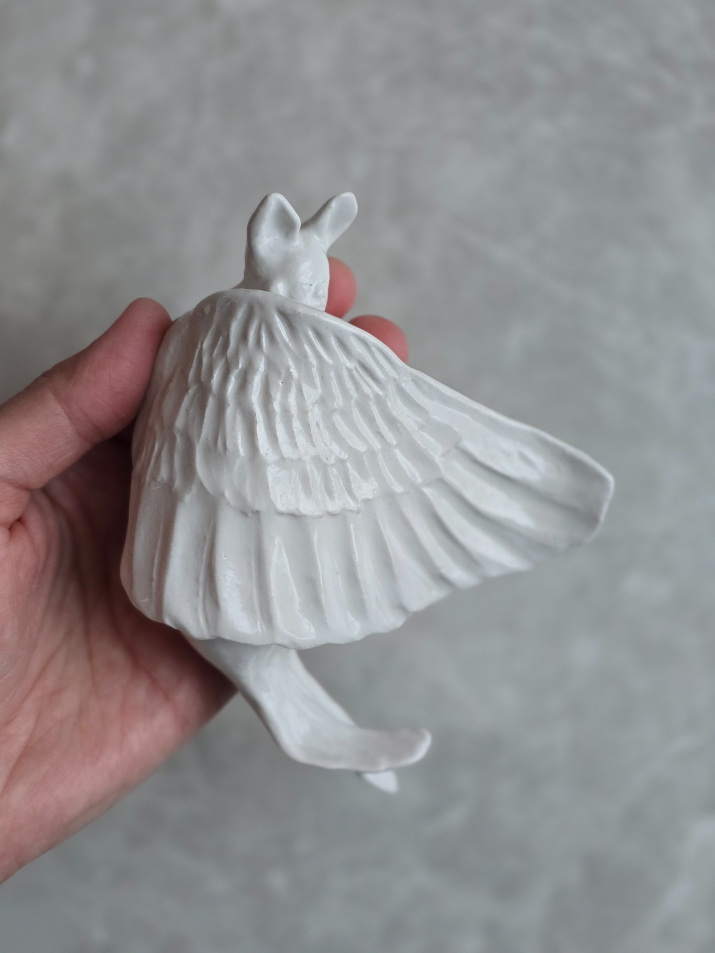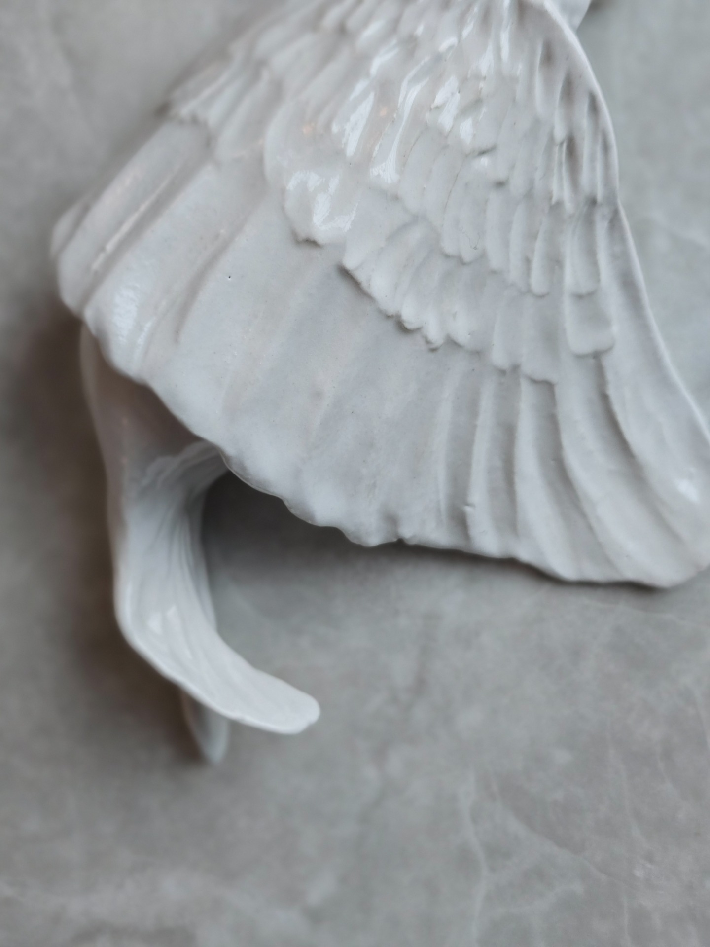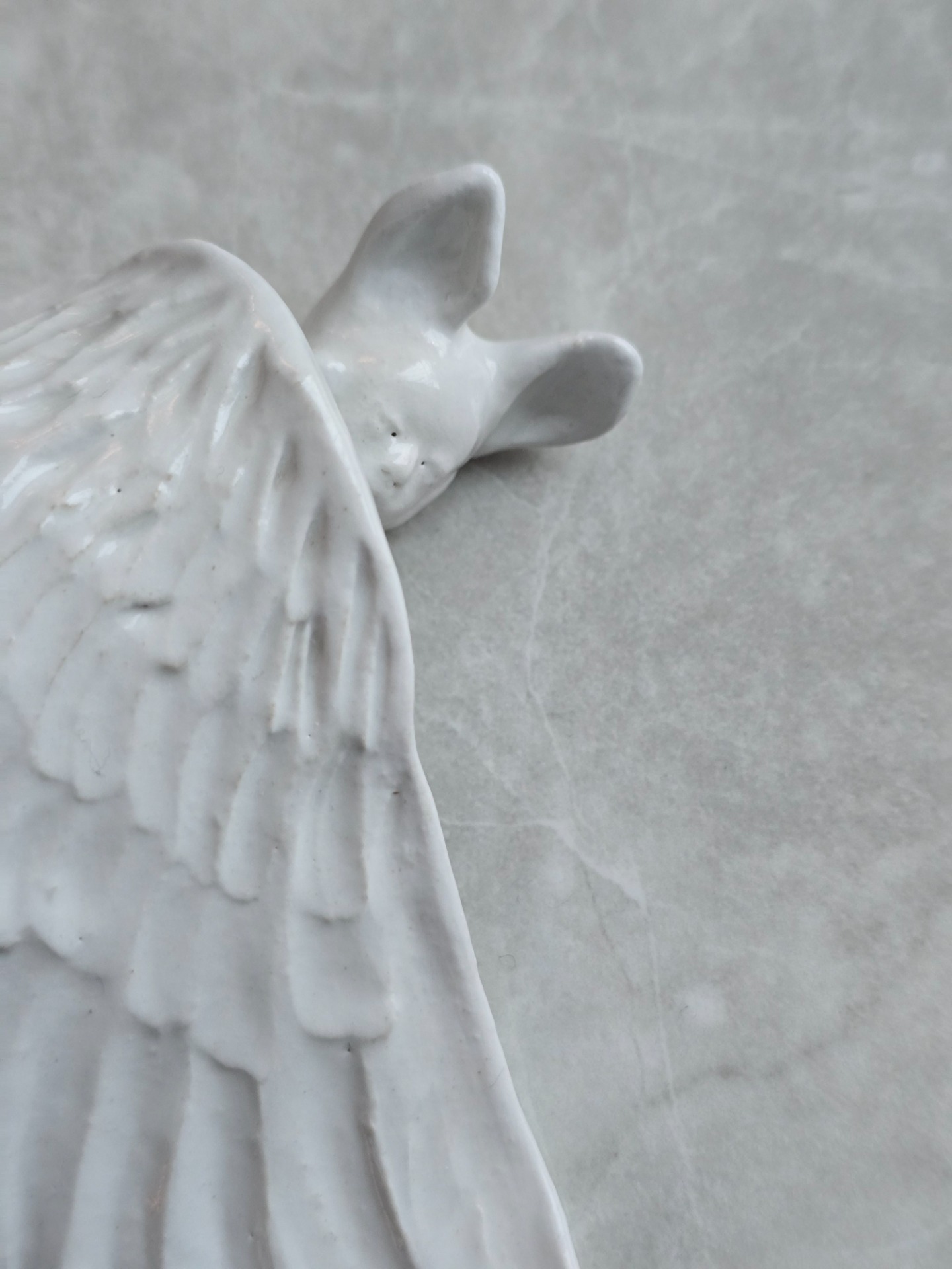 Människofåglar – stillsamma väsen som rör sig någonstans mellan människa och fågel. Varje vägghängd skulptur är varsamt formad och klädd i en vit, blank glasyr som fångar ljuset och ger liv åt ytan. De tar inte stor plats, men de vill gärna bli sedda – som en tyst påminnelse om skörhet, frihet och det som binder oss samman.