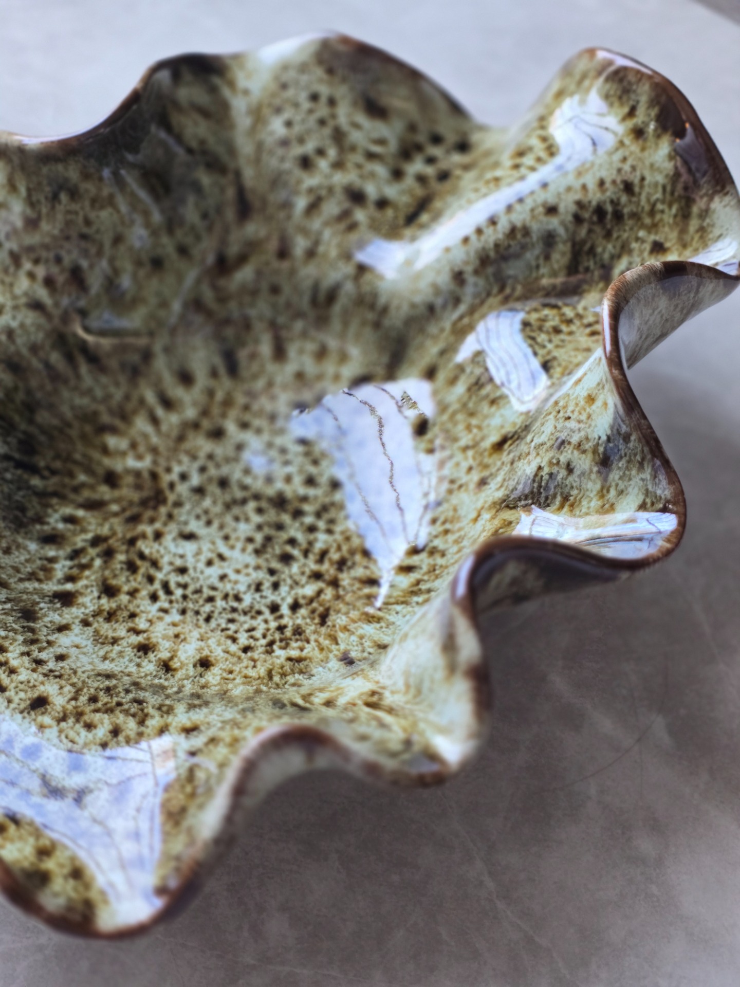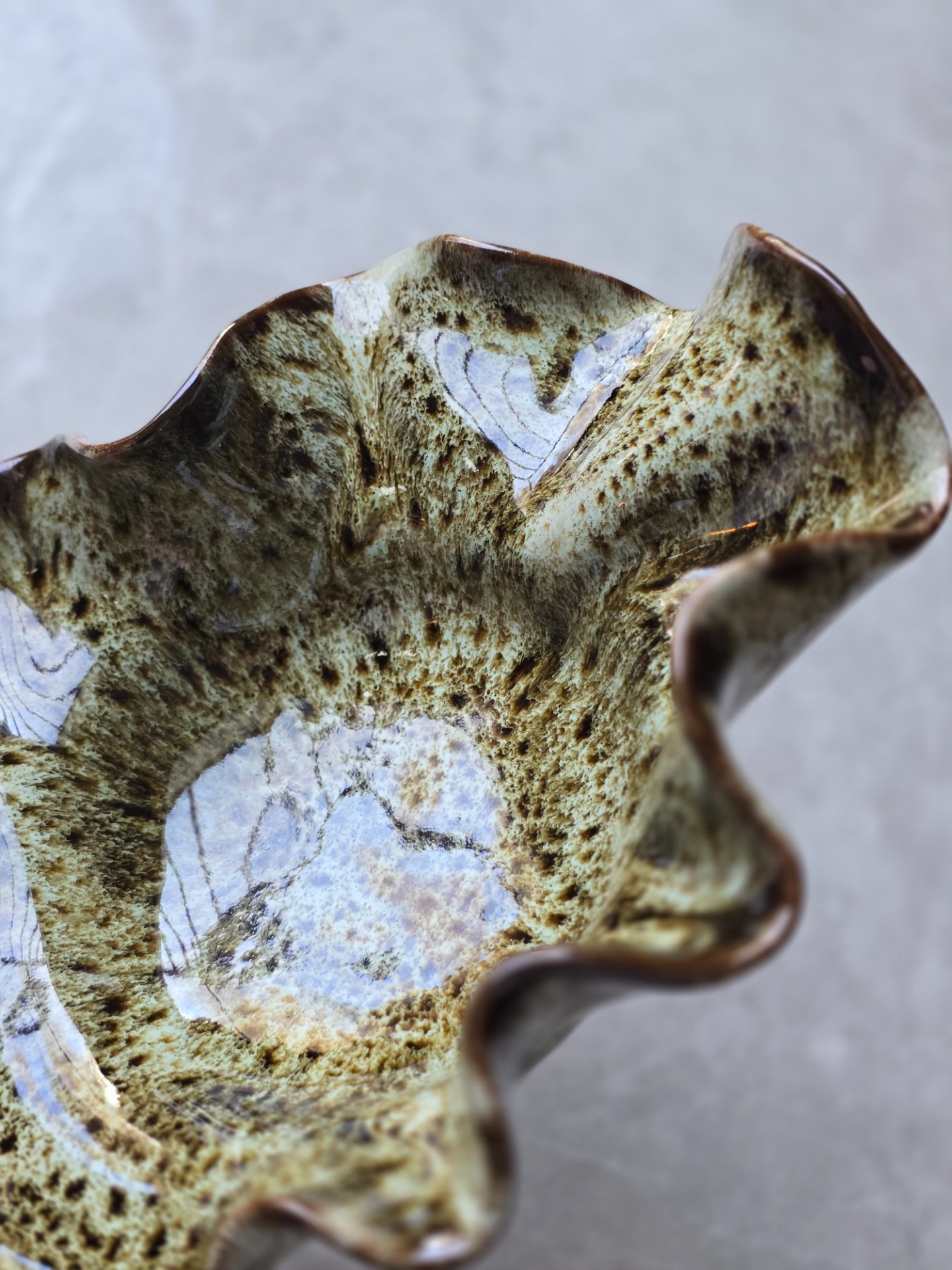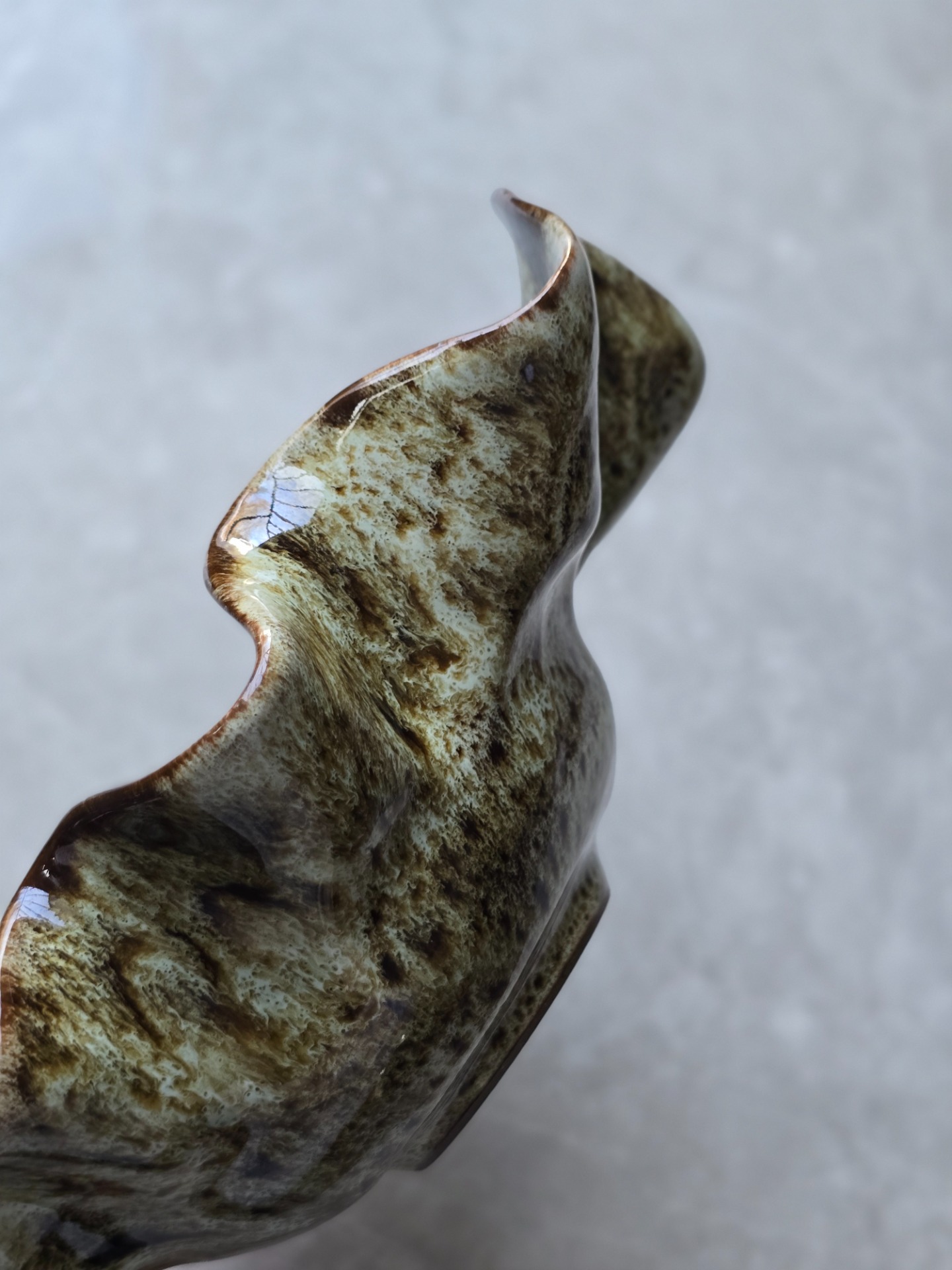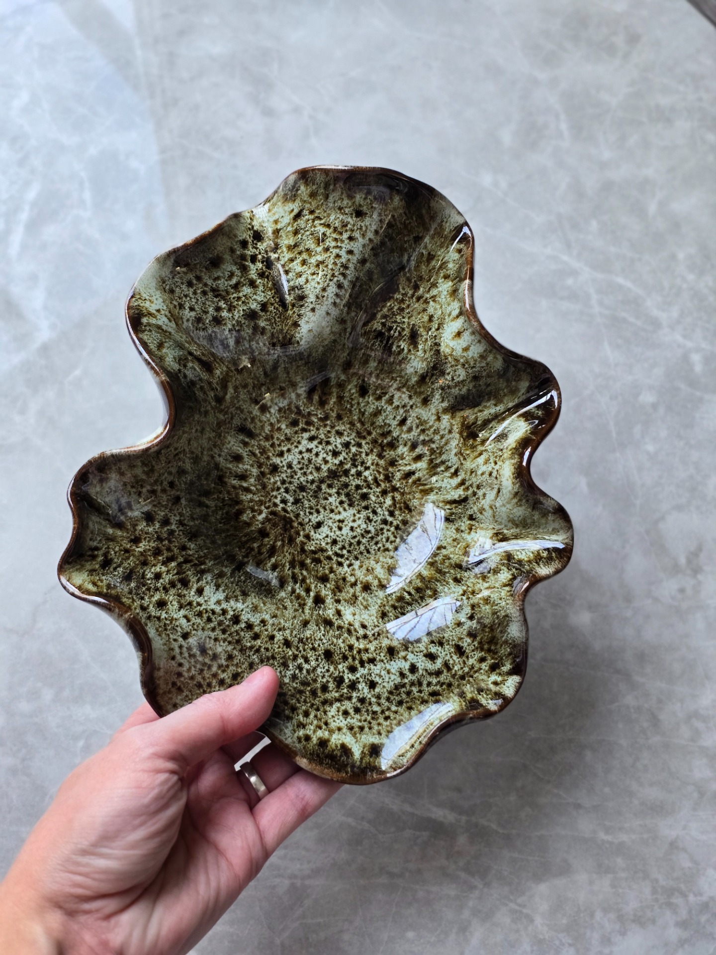Vågig skål i stengods. Formad för hand med mjukt böljande kanter. Glasyren i grönbruna toner skiftar naturligt över ytan, vilket gör varje skål unik. De fungerar lika väl som dekorativa objekt på bordet som till vardagens servering – en plats för karameller, tillbehör eller bara som blickfång i rummet.