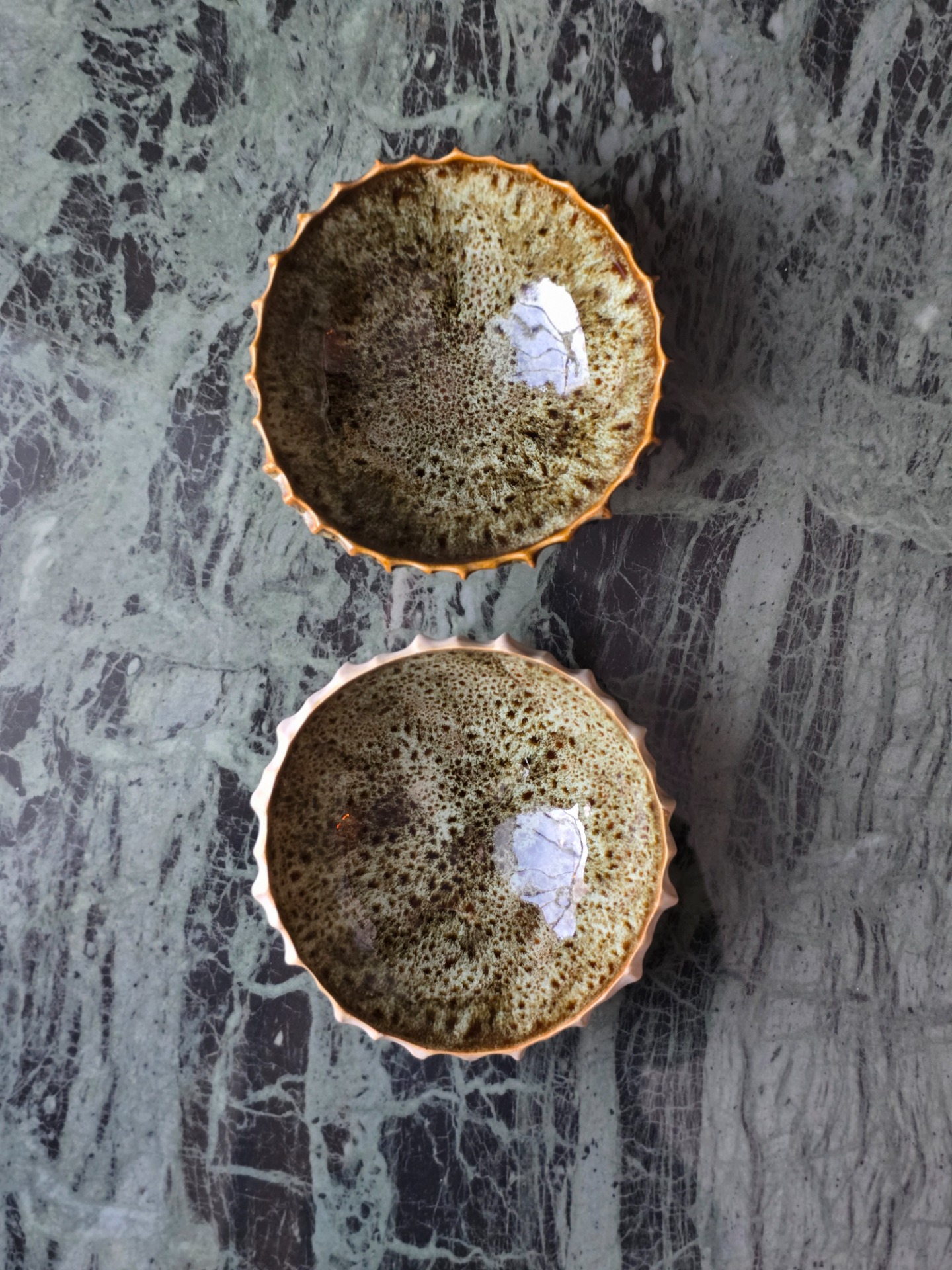 Säljes i 2-pack. En av skålarna är heltäckt i solbränd grön och den andra skålen har en vaniljbeige, satinmatt utsida med en blank insida.