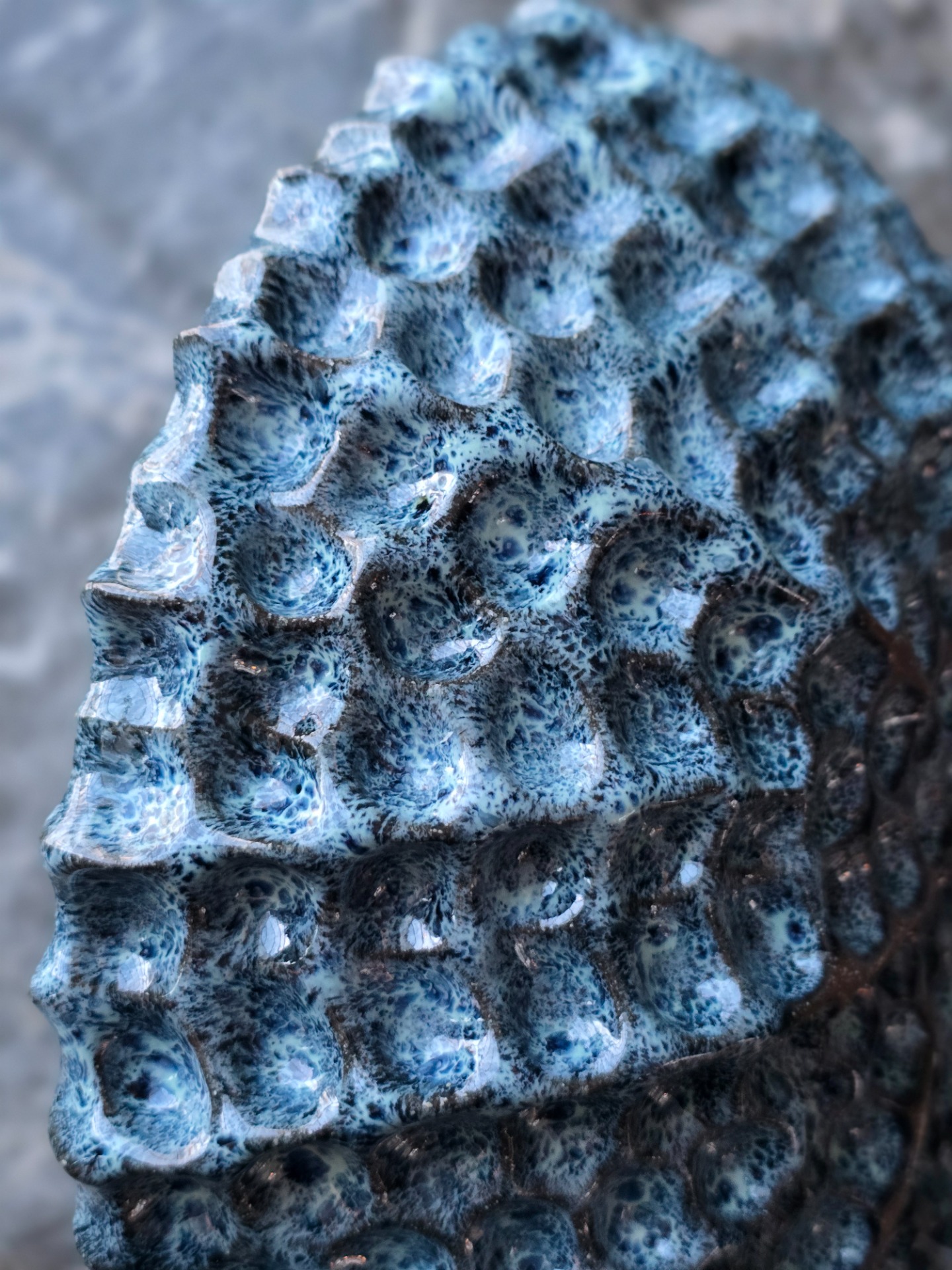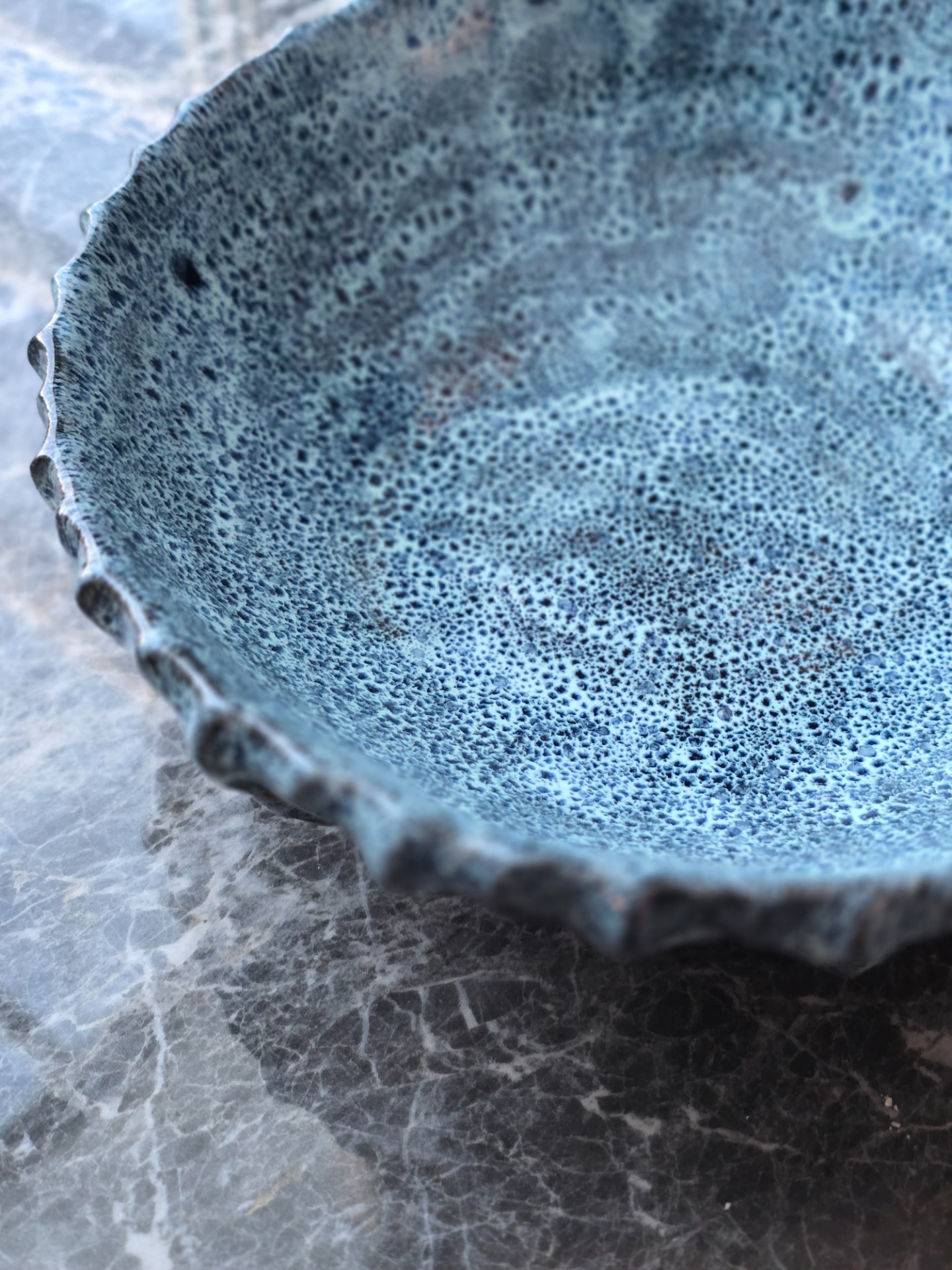 Handgjord skål i brunsvart lera. Glaserad i blåvita nyanser.